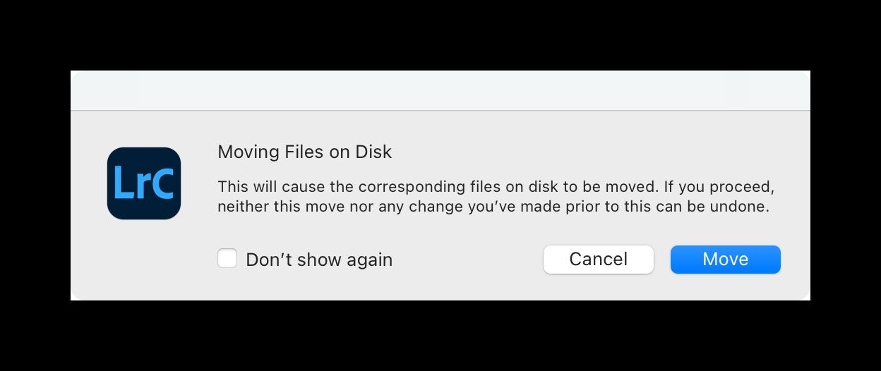 Move folder to new folder — Again in Lightroom's Folders panel, drag the folder of images you want to move onto the newly created folder. Lightroom will display the alert shown below to confirm the change.
