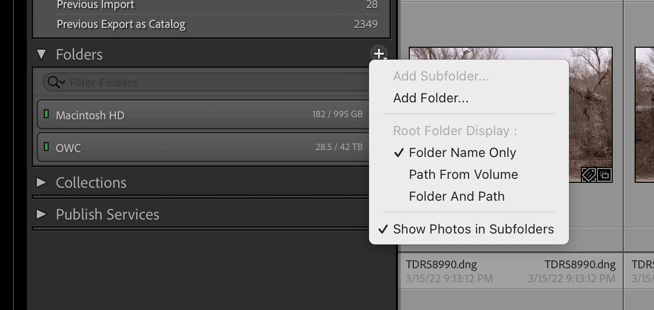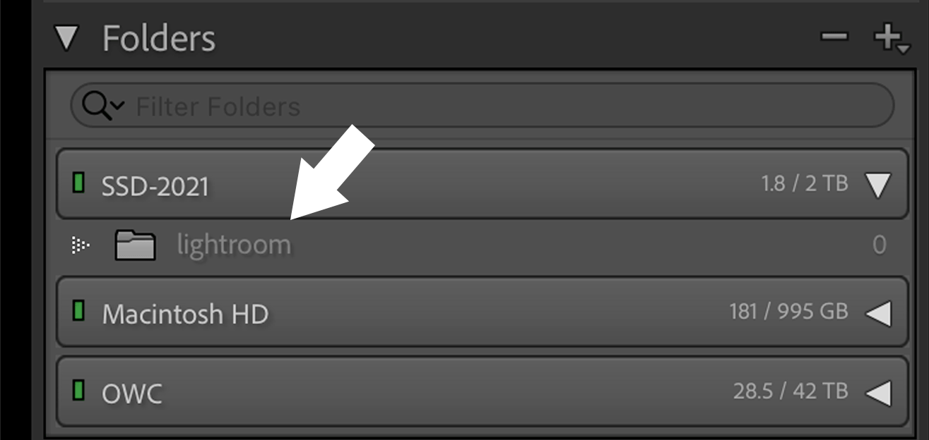 Create new folder on destination drive — In Lightroom, click Library in the top menu, then click the plus (+) button at the top of the Folders panel. In the dropdown-menu that appears, click Add Folder...