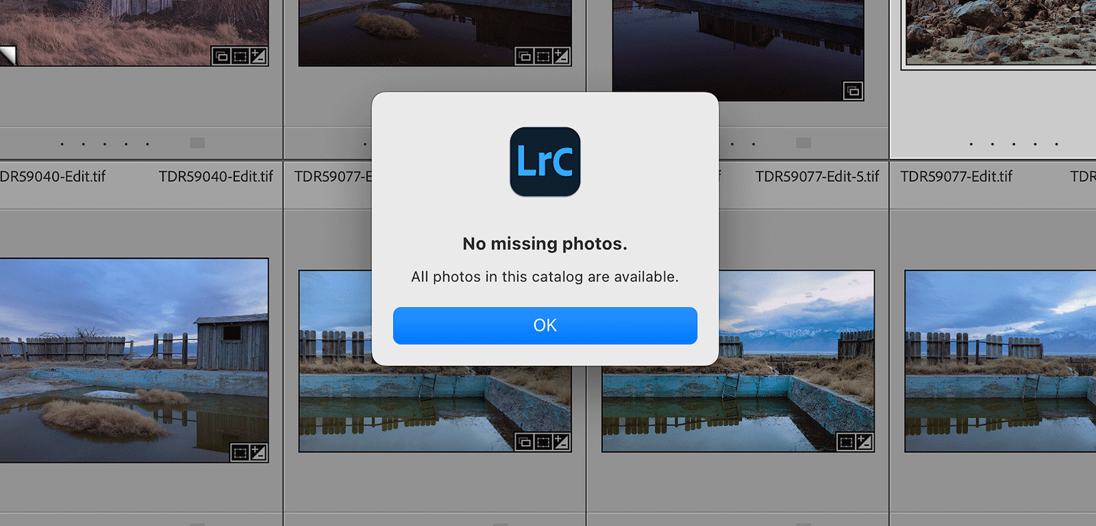 If any images are missing, Lightroom will automatically create a new Missing Photographs catalog in the Catalog panel.