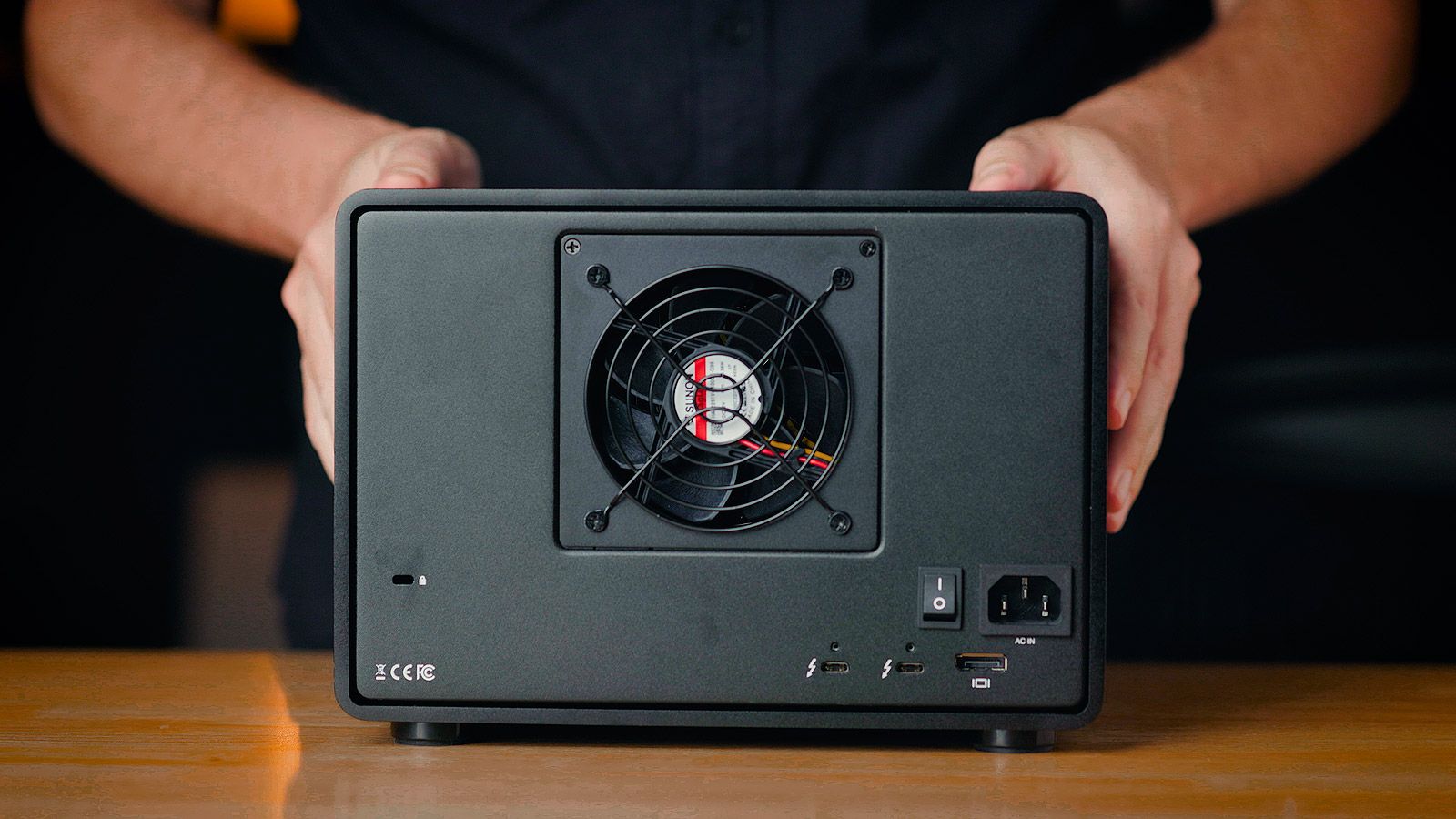 The back of the ThunderBay 8 has a security lock, display port and two Thunderbolt 3 / USB-C ports. One USB port is for connecting the ThunderBay to a single Mac or PC (cable included), while the other may be used to daisy-chain another ThunderBay for more storage, connecting an external drive, peripherals, or a monitor. You may also connect a second monitor to the display port.