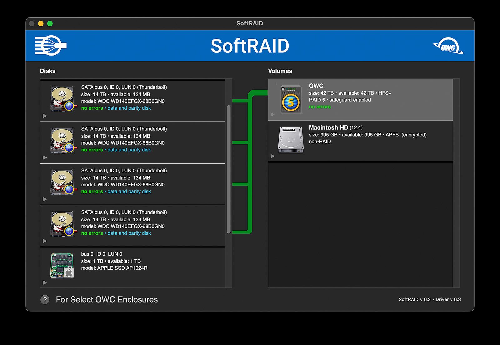 Drive initialization and formatting is handled through SoftRAID XT. This is third party macOS and Windows software developed in partnership with OWC.