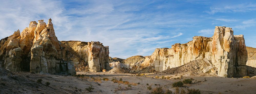 After hiking a couple of miles to get there, I was confronted with an enormous valley framed by towering spires of glowing orange, yellow and pink rock. Nestled in-between, mysterious white hoodoos rising from the earth alongside piles of rocks and boulders that had chipped-off the decaying buttes high above.