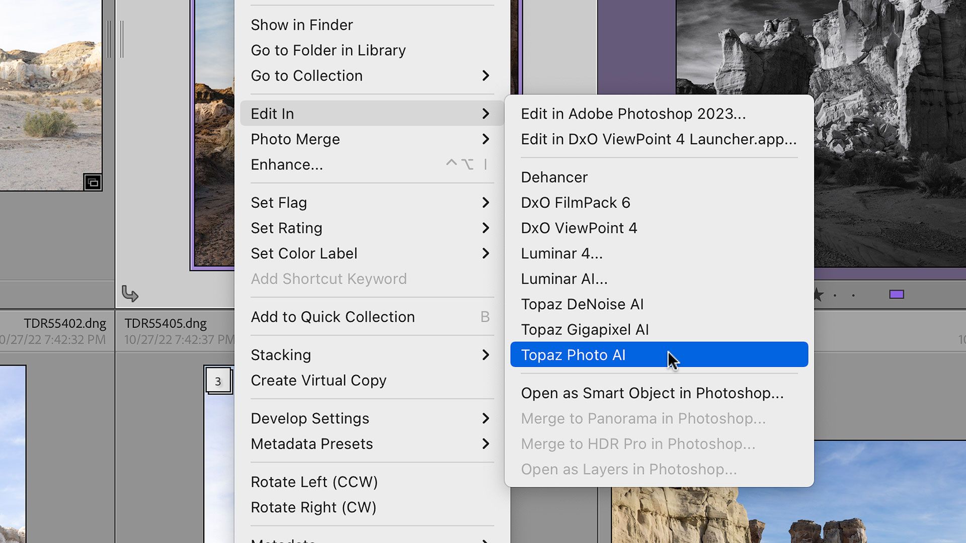 When used as a plugin with Adobe Lightroom Classic, there are two methods for editing RAW files. First is opening the RAW file as a 16-bit TIFF, which can be done by right-clicking on one or more RAW files, then selecting Edit in > Topaz Photo AI (image below). This method is helpful when develop settings have been applied to a RAW file in Lightroom, and you'd like to see those edits in Photo AI.