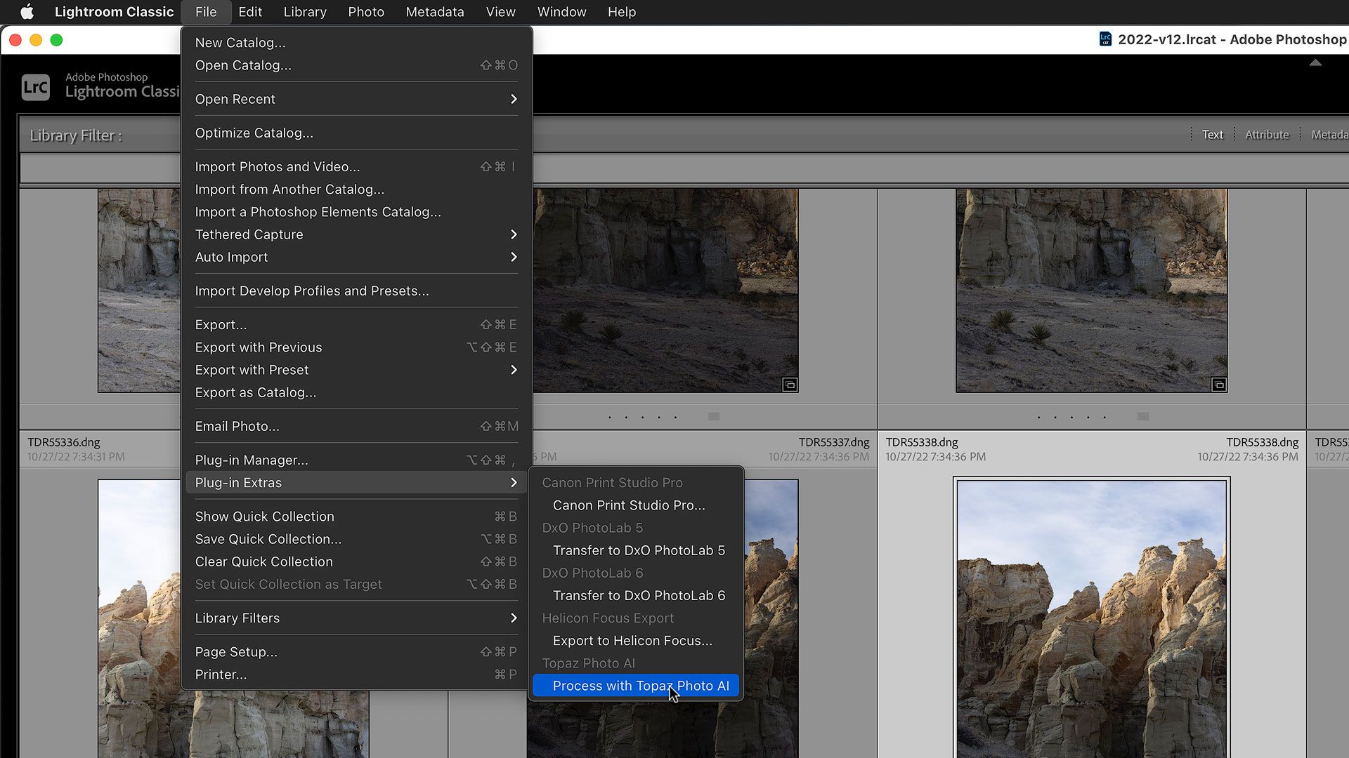 Second method edits the RAW file itself (not rasterized TIFFs) by selecting File > Plug-in Extras > Process with Topaz Photo AI (pictured below). The plugin then prompts the user to choose between a copy of the RAW file or the original. I highly recommend creating copies to avoid overwriting and replacing the original RAW data created by the camera. Note that any Develop settings assigned to the RAW file are ignored by Photo AI.
