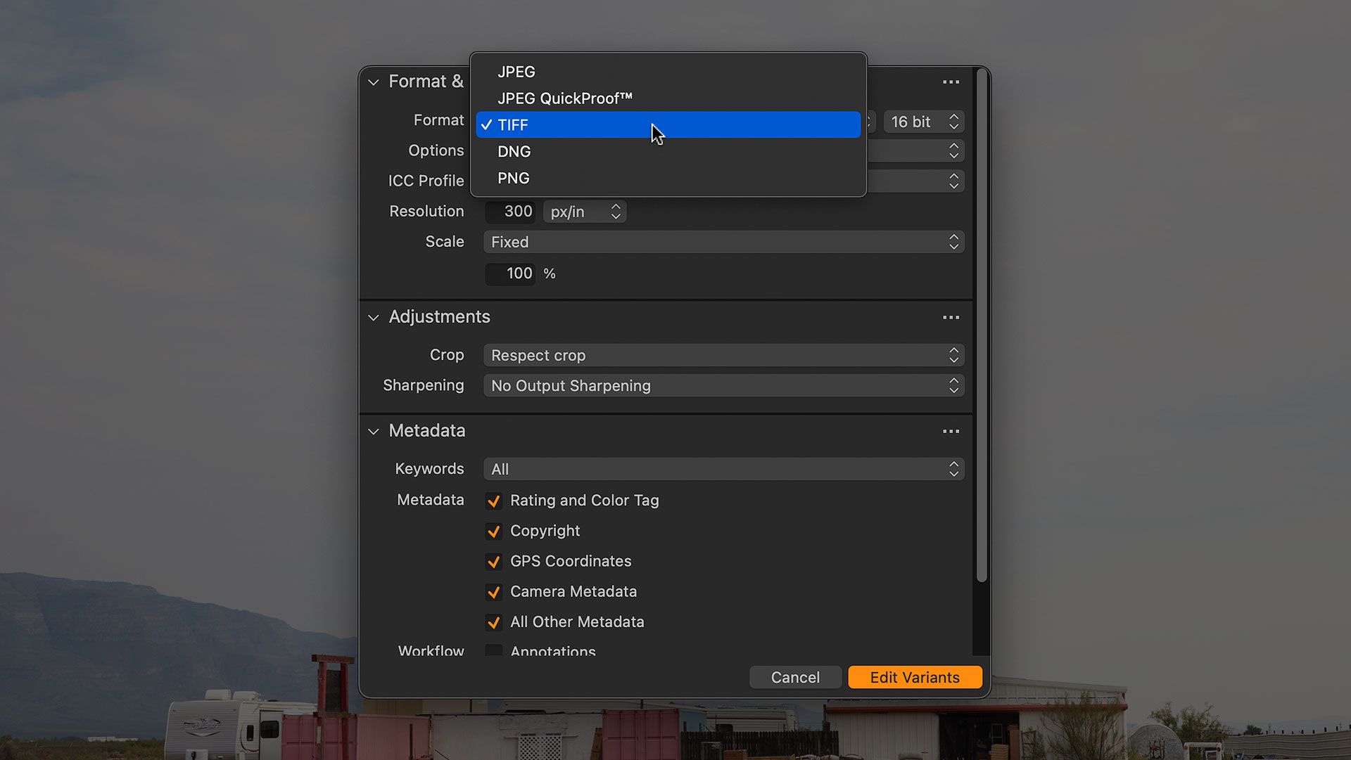 Capture One exports RAW images to Photo AI by selecting Image > Edit With > Process with Topaz Photo AI from the top menu. This displays a window (pictured below) that generates a variant of the RAW file as a JPG, TIFF, DNG or PNG, then opens that variant in Photo AI (thus protecting the original RAW file).