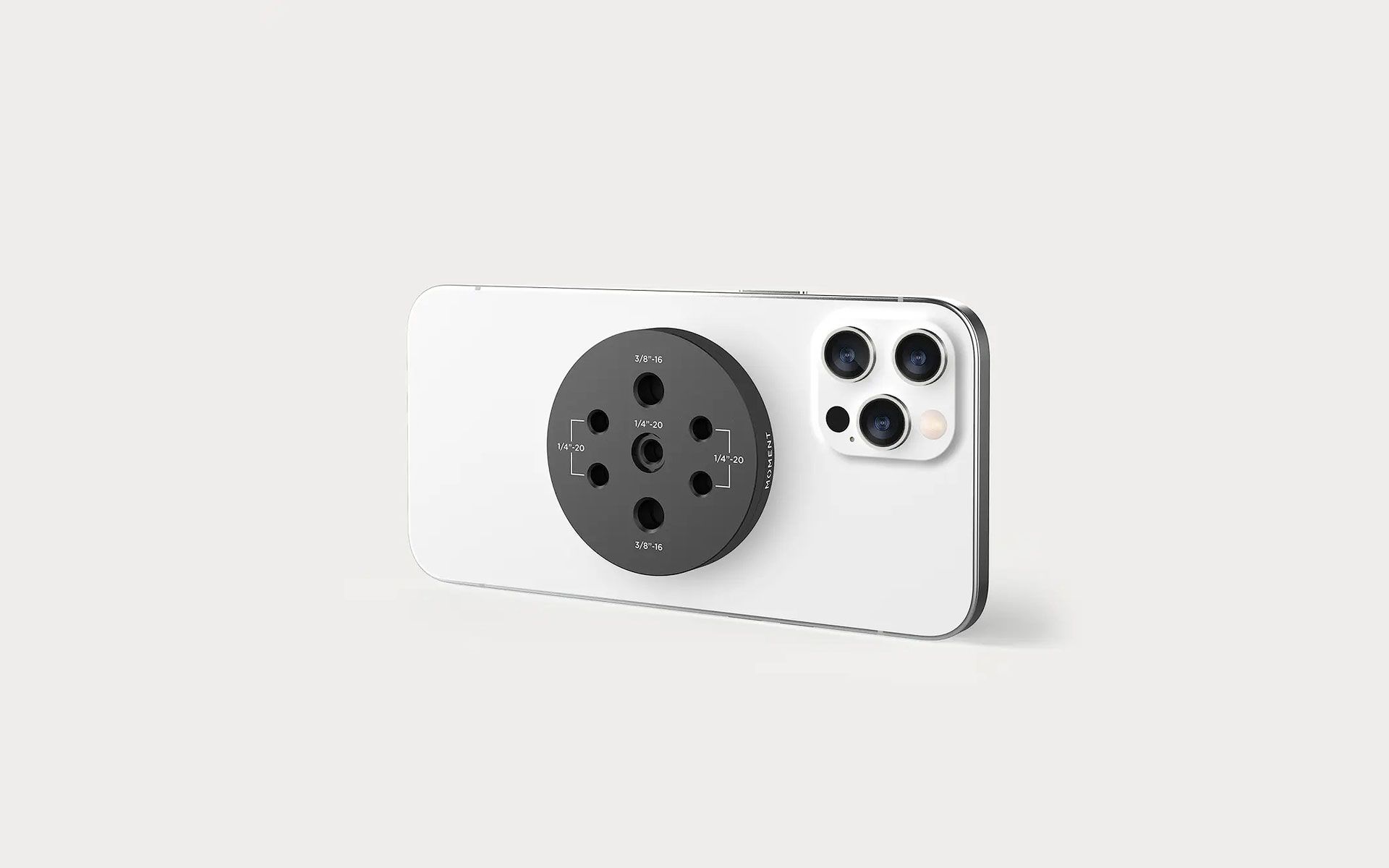 I haven't had a chance to talk about these yet, but Moment makes fantastic MagSafe camera mounts for mobile photography and videography. The MagSafe Tripod Mount is simple, clean, and works beautifully for horizontal and portrait orientations, but I'm especially fond of their MagSafe Multi-threaded Mount. This is essentially a magnetized cheese plate for mounting magic arms or other accessories. Makes mounting and positioning newer iPhones super easy, especially for overhead photos and videos.