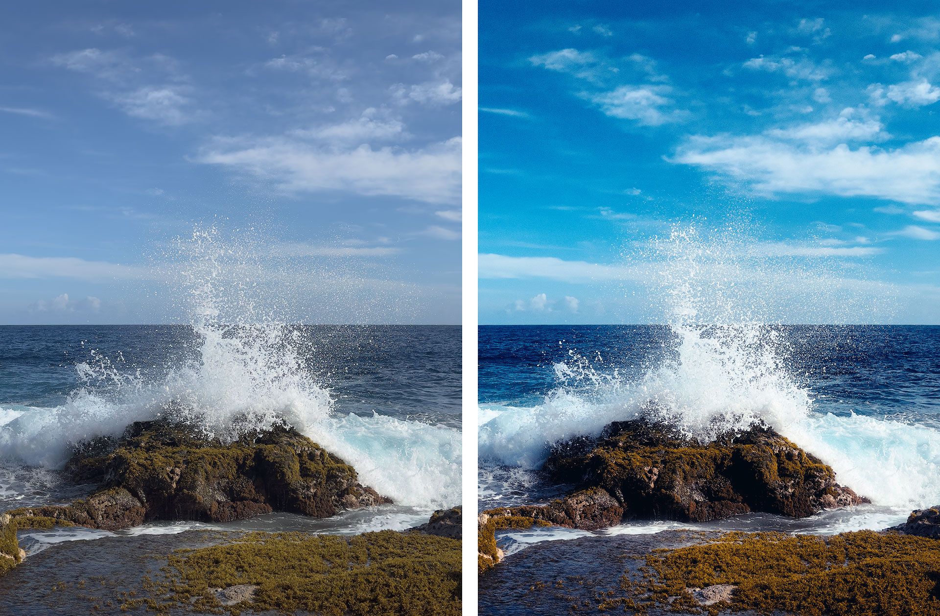 Check out how dense and beautiful the blues are, and how the highlights in the crashing wave give off a diffused glow. The image isn't the same as viewing an actual color slide of Velvia 50 on a light table or through a projector, but the colors and tonality of the digital emulation successfully mimic the visual richness and character of Velvia, with little additional involvement from me. I simply selected the Velvia 50 film emulation, tweaked contrast a bit, added a touch of grain and "bloom" to the highlights, and that's about it.