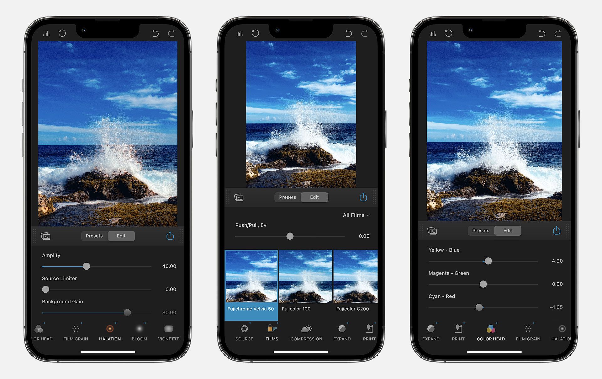Users of Dehancer's desktop plugins should feel right at home, for the mobile editor is organized almost exactly the same way. Edits begin with technical corrections to white balance, tint and exposure in "Source" (if not edited already in a RAW file), followed by selecting a film emulation profile in "Films". Film selections are non-destructive, so you're free to experiment with different looks to find just the right one.