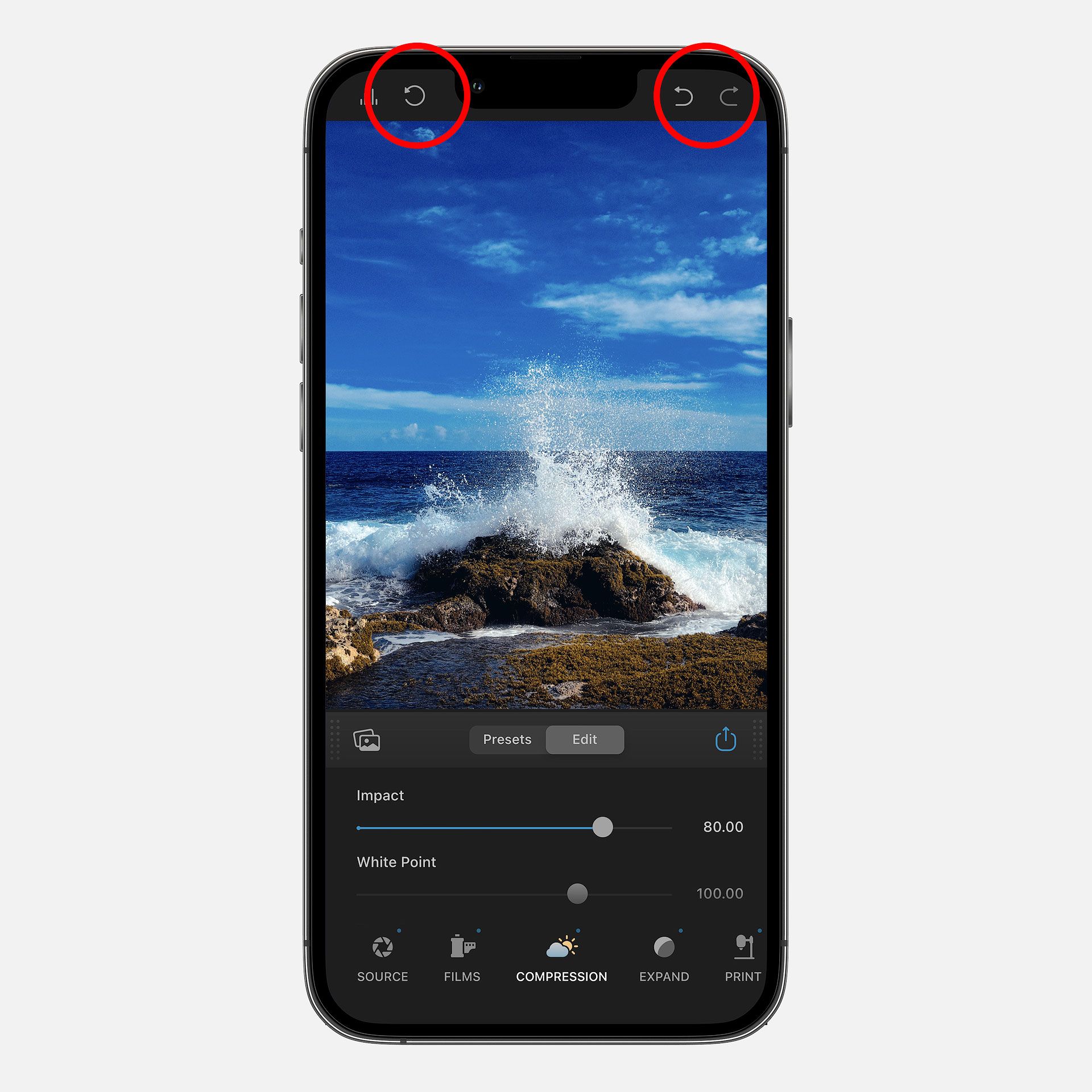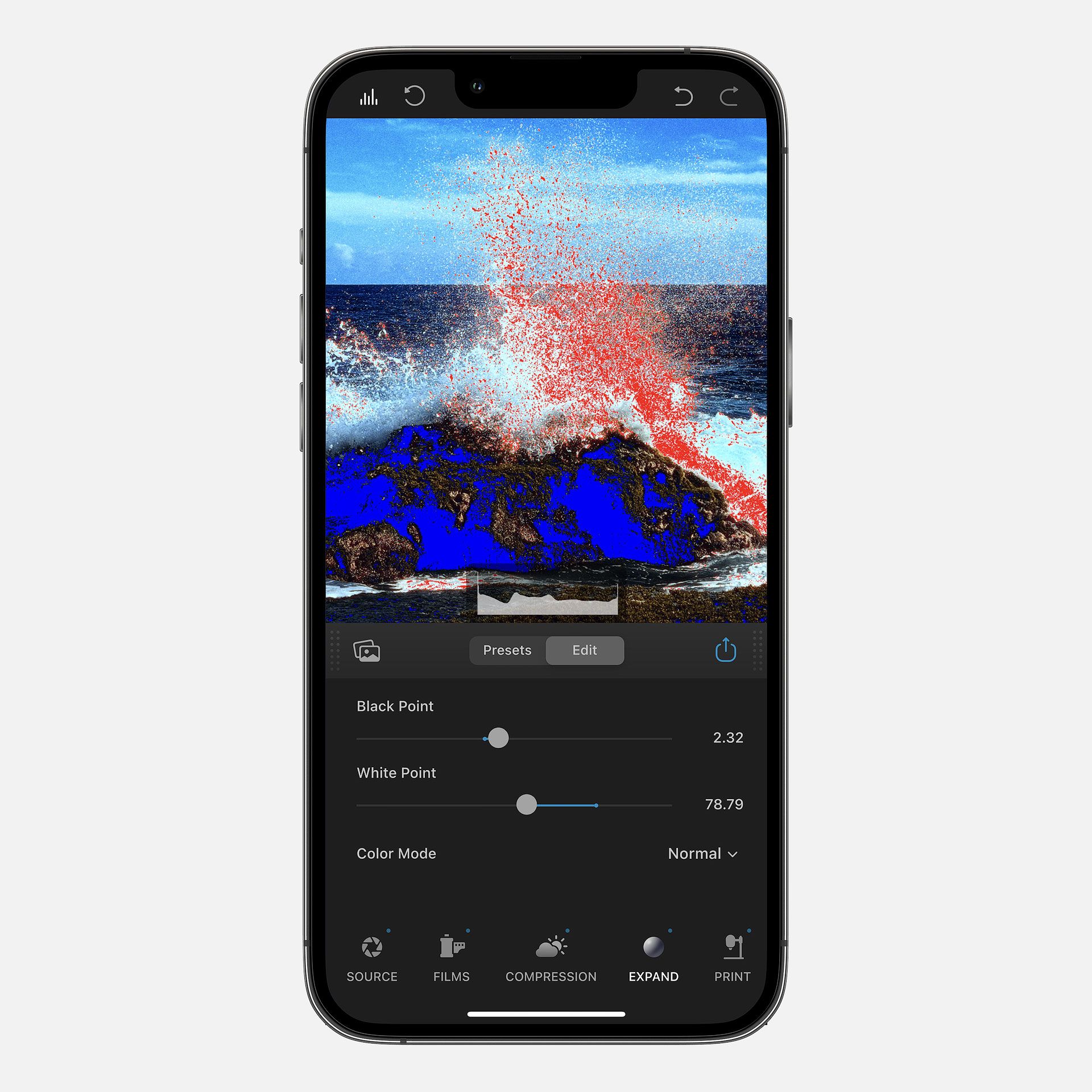 After correcting exposure, white balance, and selecting a film, the next steps are adjusting the white point, black point, and contrast using the "Compression", "Expand" and "Print" tools. To better understand the difference between these, I recommend reading the Dehancer for iOS Quick Guide (PDF).