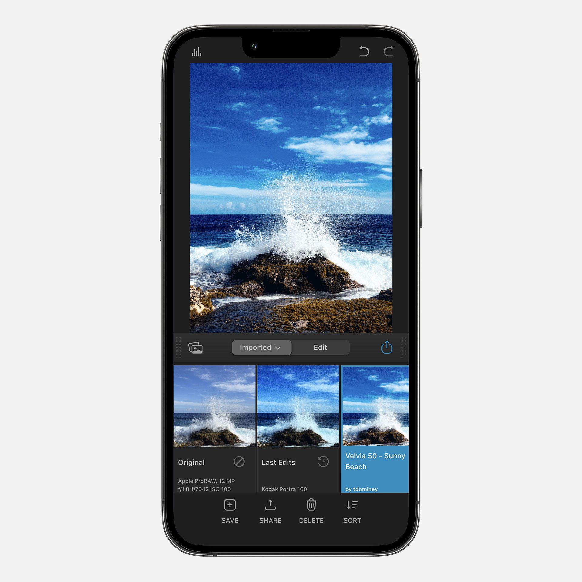 When ready to take the wheel and edit an image yourself with or without a preset, tap "Edit" in the toolbar to explore Dehancer's full suite of editing tools.