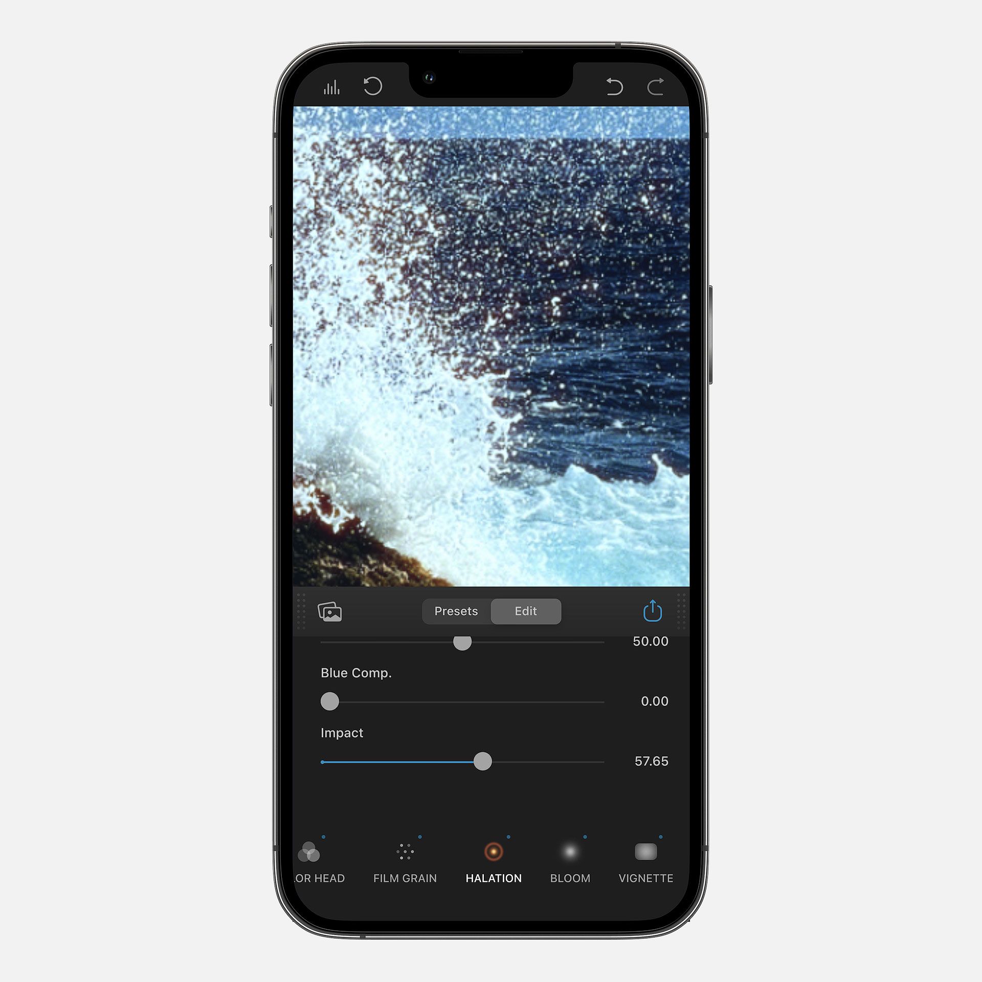 When satisfied with the general look of an image, the finishing step is applying "Film Grain", "Halation", and/or "Bloom". These emulate natural aberrations that occur when shooting and processing film, increase realism, and make digital images look less digital. To avoid applying too much of these effects (which can happen when editing a small thumbnail), I recommend upscaling the preview image to 200% by double-tapping the image, or pinch/zoom to your preferred scale.
