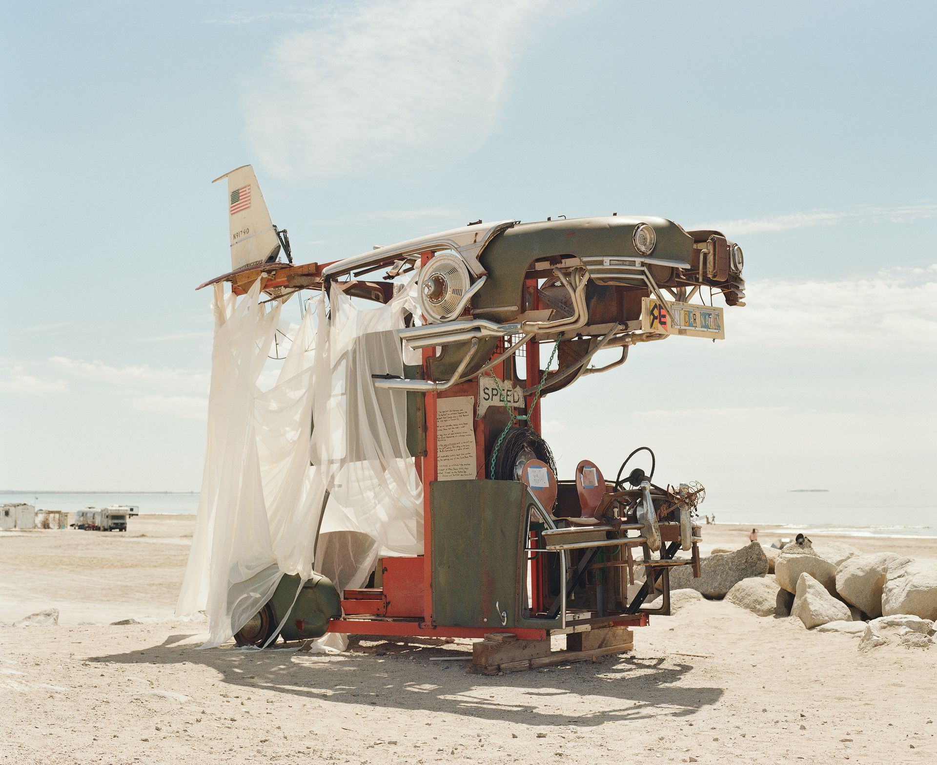 But there were also surprising signs of life. Roads had recently been repaved. Twenty somethings wearing sunglasses and pastel muscle shirts glided around on electric unicycles. Recreational camper vans and buses were parked on the beach. Intriguing sculptures mostly constructed from scrap and junk were everywhere. There were even a few cheap Airbnbs, including this 70s themed trailer with a giant white egg on its roof.