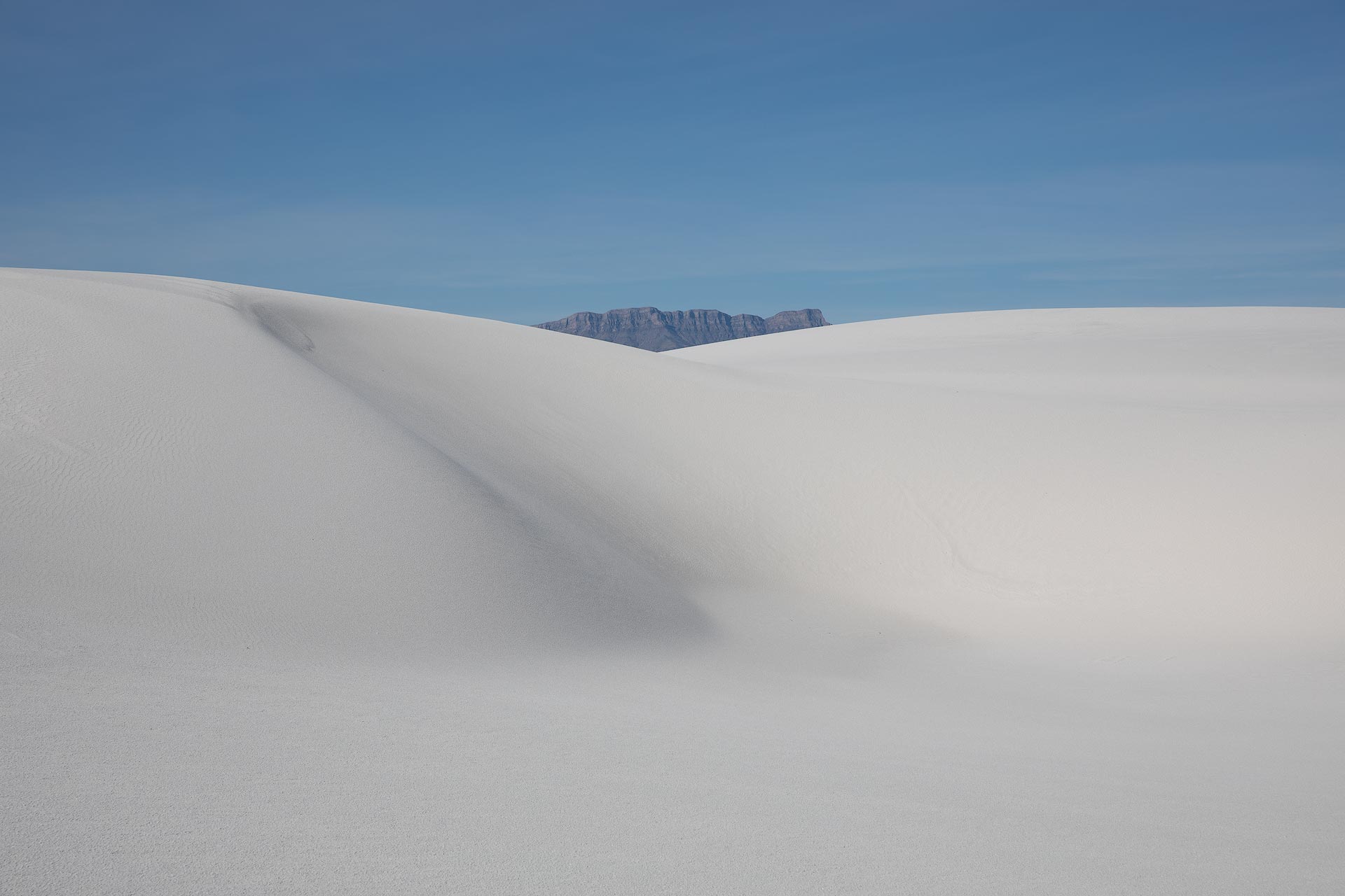 But that bright, harsh, midday light works fantastically well in black and white. The white dunes almost appear to glow from within, and the mountain framed in the middle now has visible detail and texture that couldn't be seen in the color image. The geometry, shapes and lines are also stronger and more well defined.