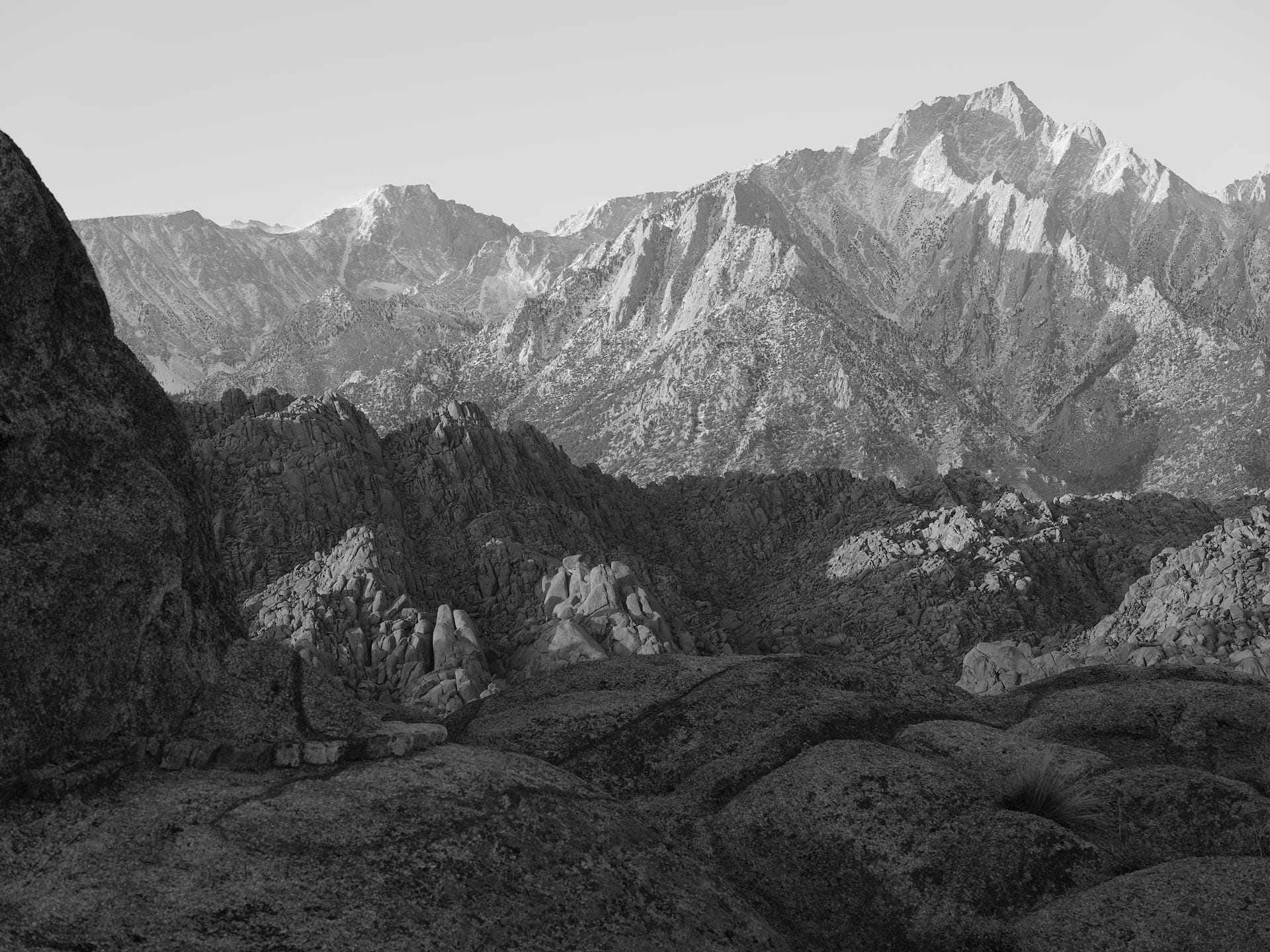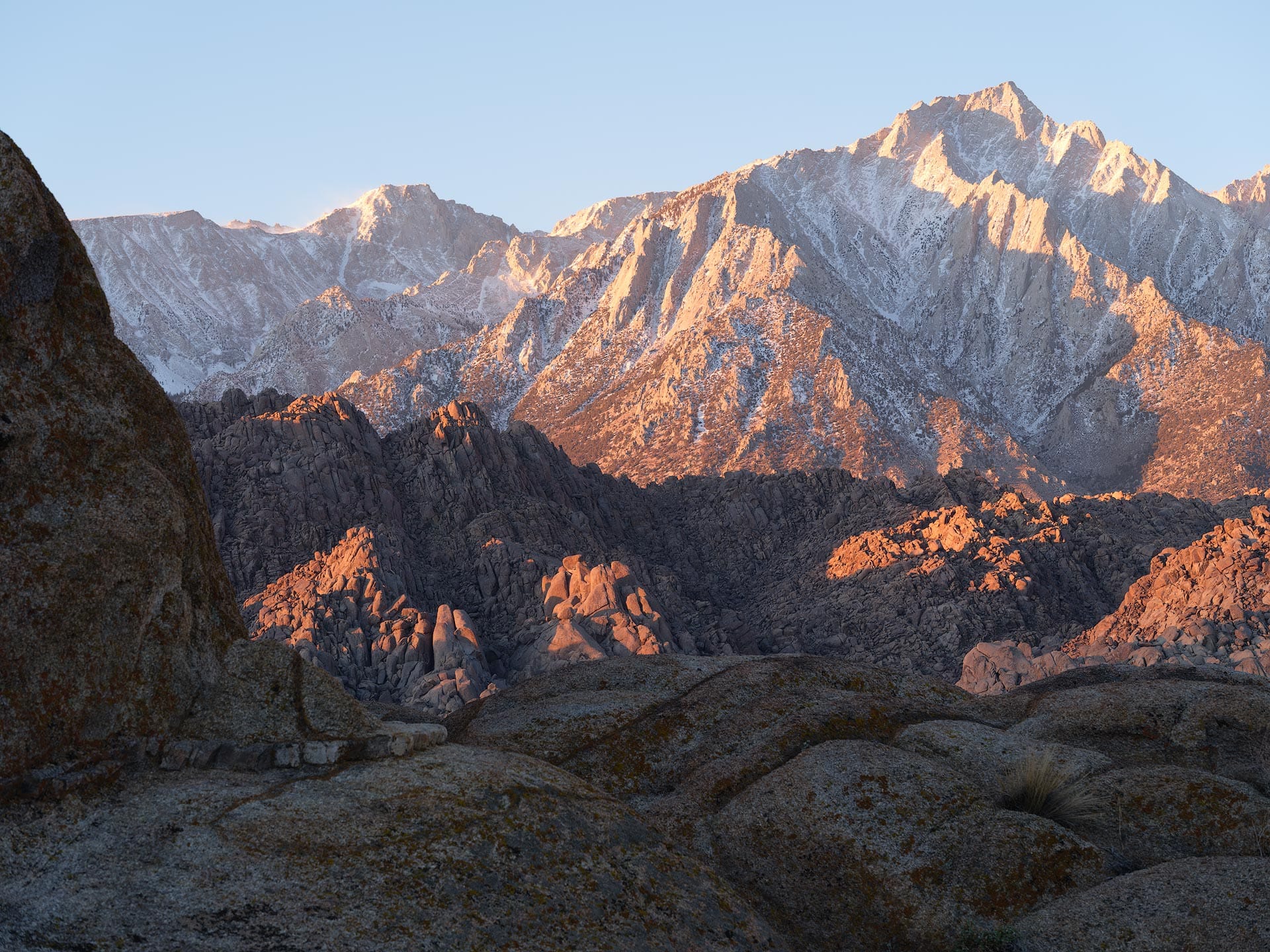 Two years prior, I used a long telephoto lens to pull the mountains close. The resultant image turned out...okay. Good color and decent composition, but the image lacked energy and atmosphere. I also questioned whether telephoto was the right choice of focal length, for it removed all surrounding context (notably, the wonderful boulders and rock formations of Alabama Hills in the valley below). Here's that image: