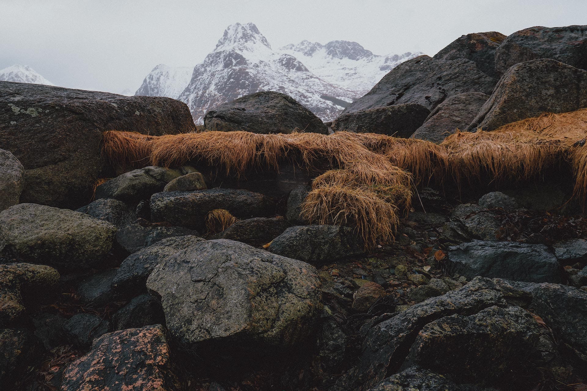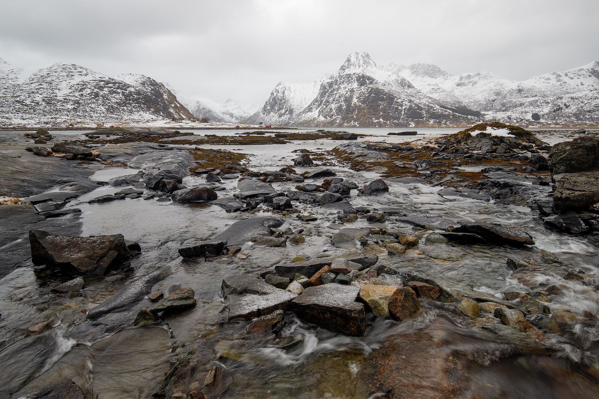 A few minutes after taking the image above, I got down into the water, changed my focal length, and tried to create more with less. Instead of merely observing from a distance, I engaged directly with the scene. My goal was to capture only the essential elements needed for the viewer to sense the cold rocks, damp ground, and the towering mountain in the background.