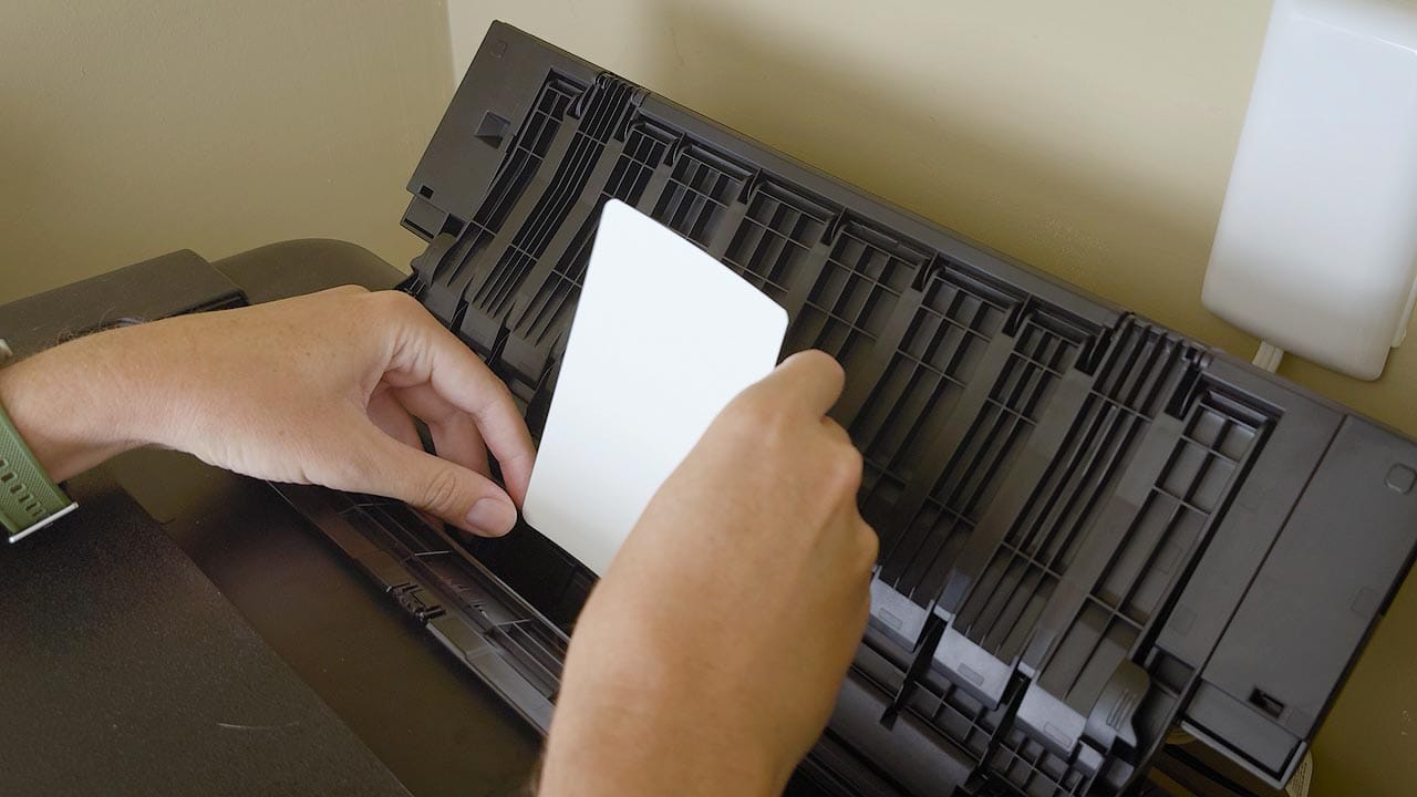 Unfortunately, I either used too much tape, my tape is too strong, or both, for the card is difficult to remove and causes damage to the back of the card. I'll try printing again with only a single, small piece of double-sided tape under the card.
