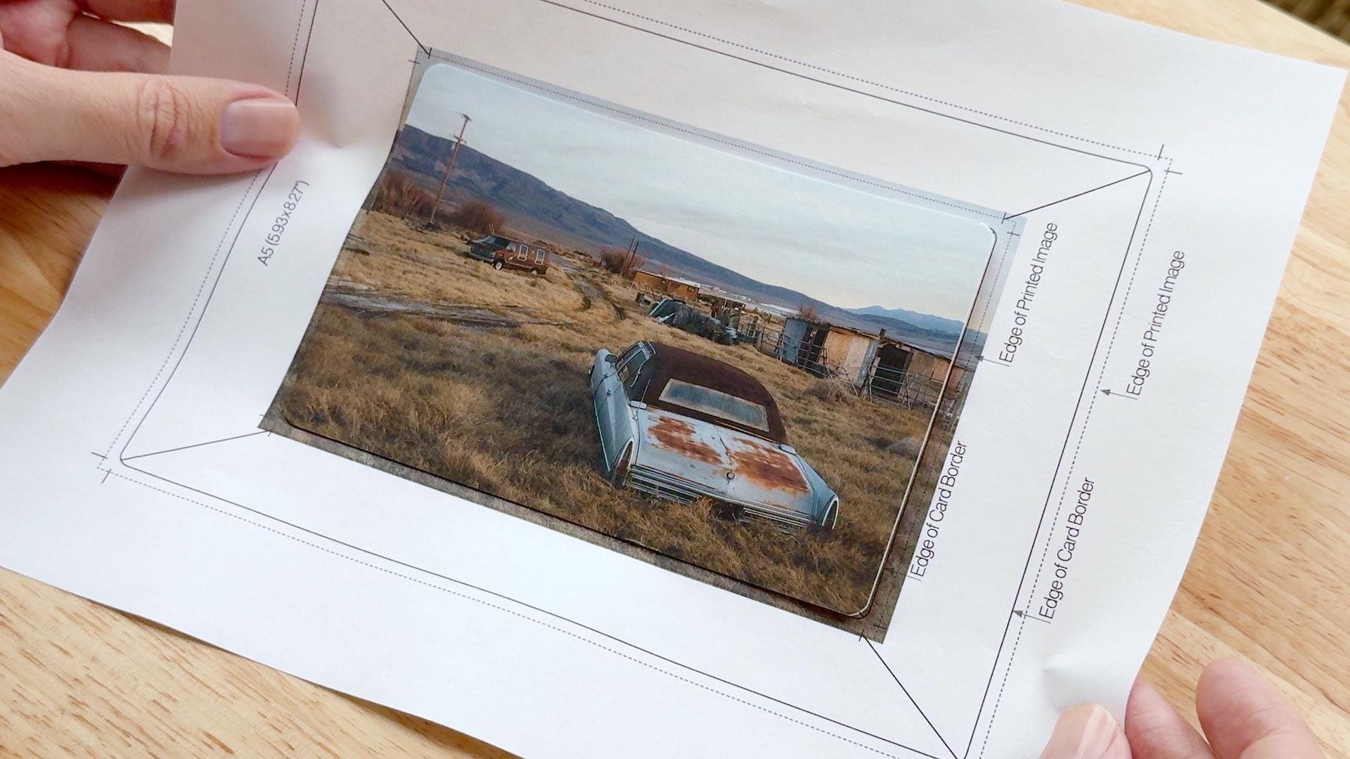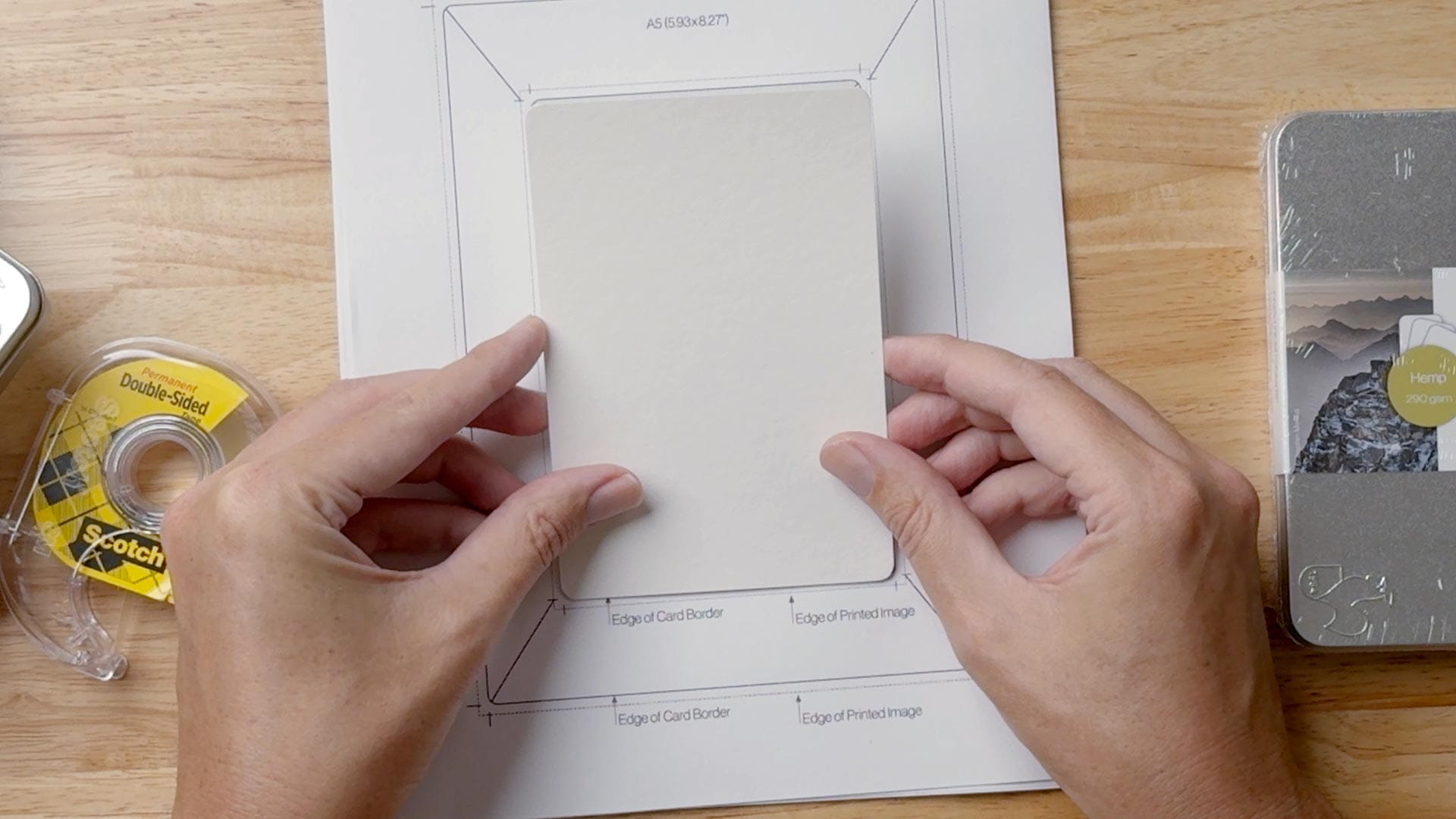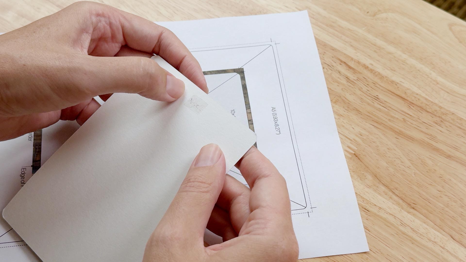 Next, Hahnemühle recommends mounting the photo cards to a sheet of paper using double-sided tape. To make this easy, the company provides a downloadable template (PDF) sized for A4/8.5 x 11" paper. Make sure to print this at 100% (actual size) to avoid scaling problems.