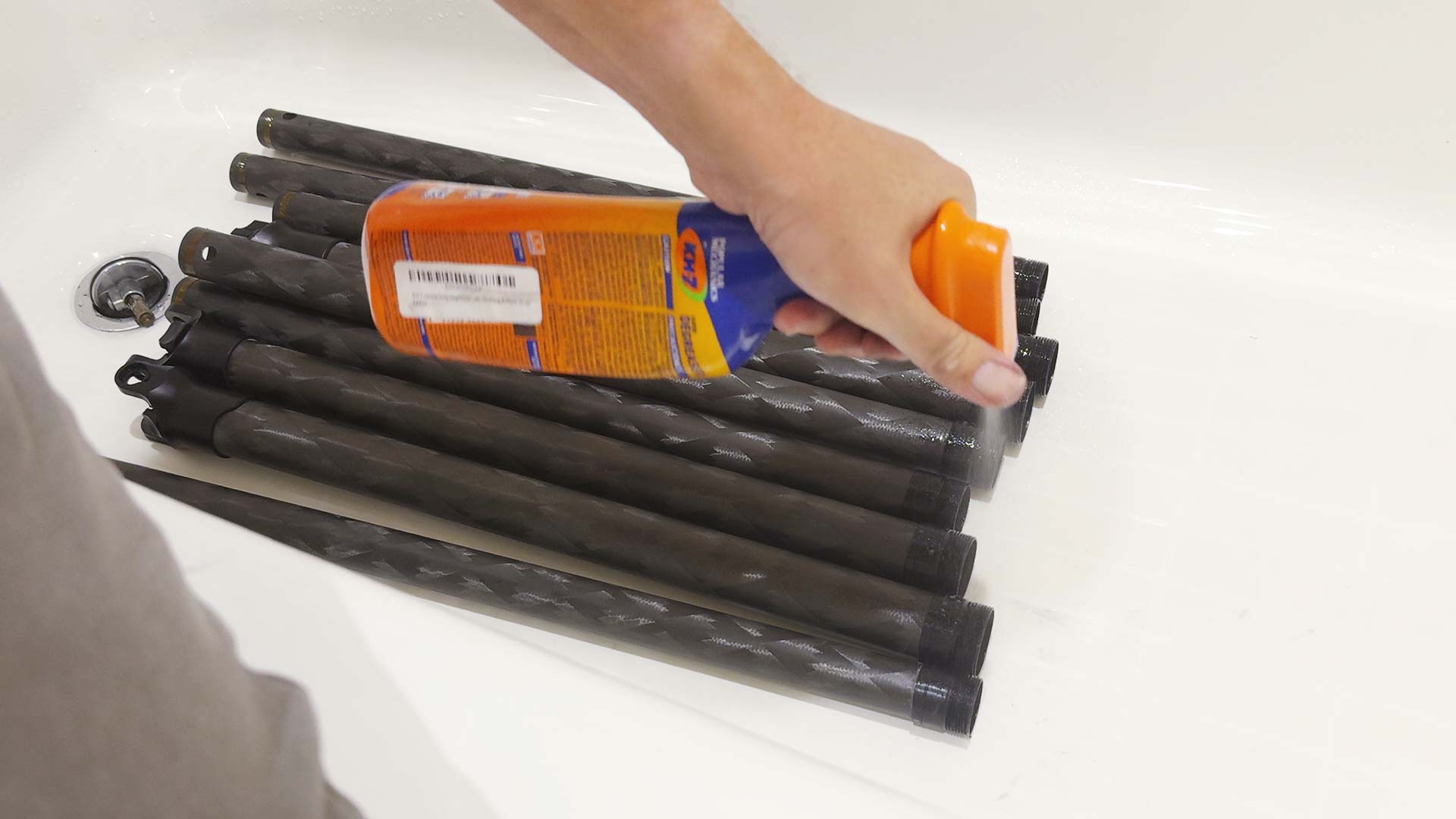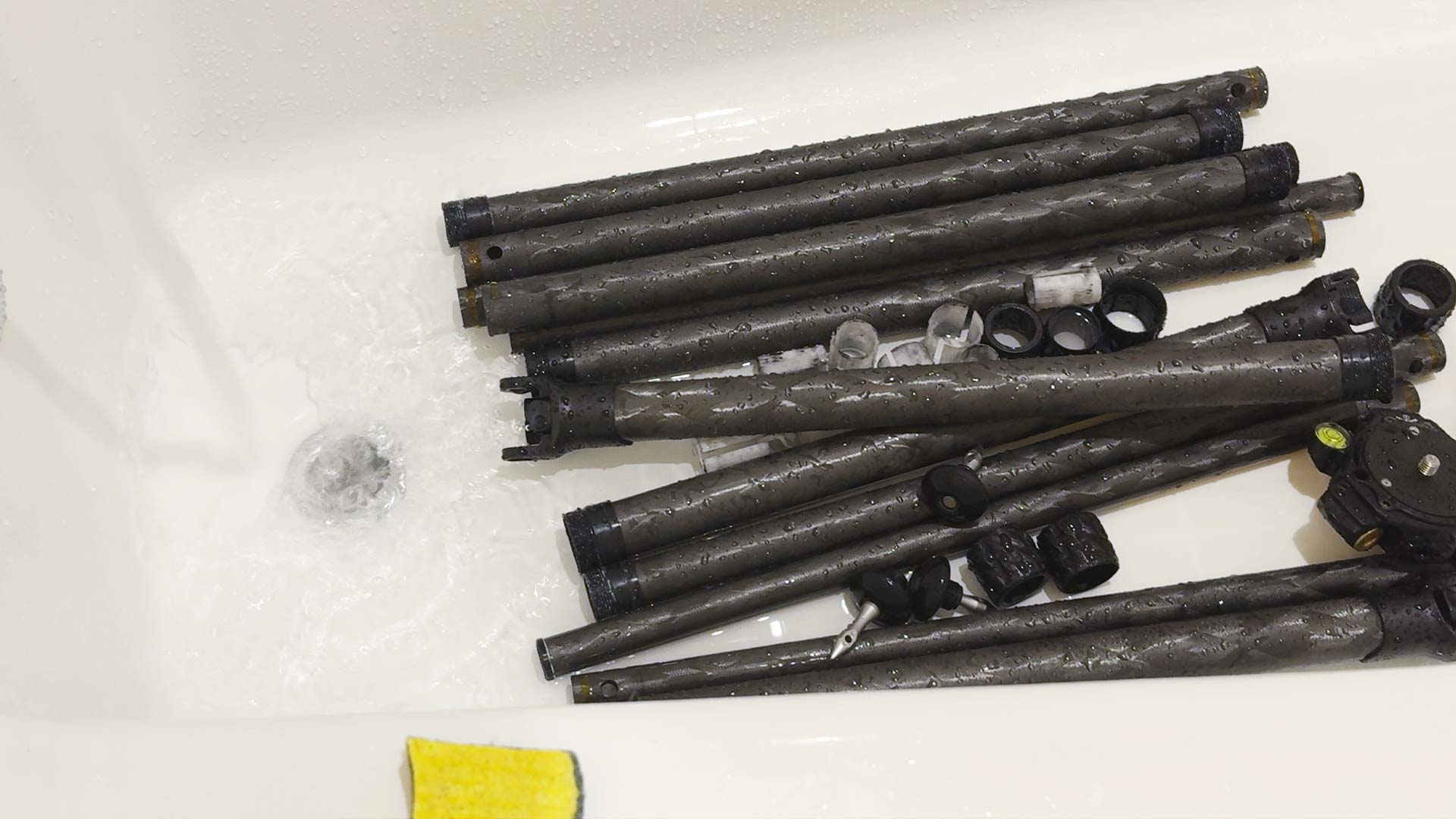 When finished washing everything with soap and water, lay a large bath towel on the ground next to the tub, then thoroughly rinse and drain each tripod piece with fresh water.