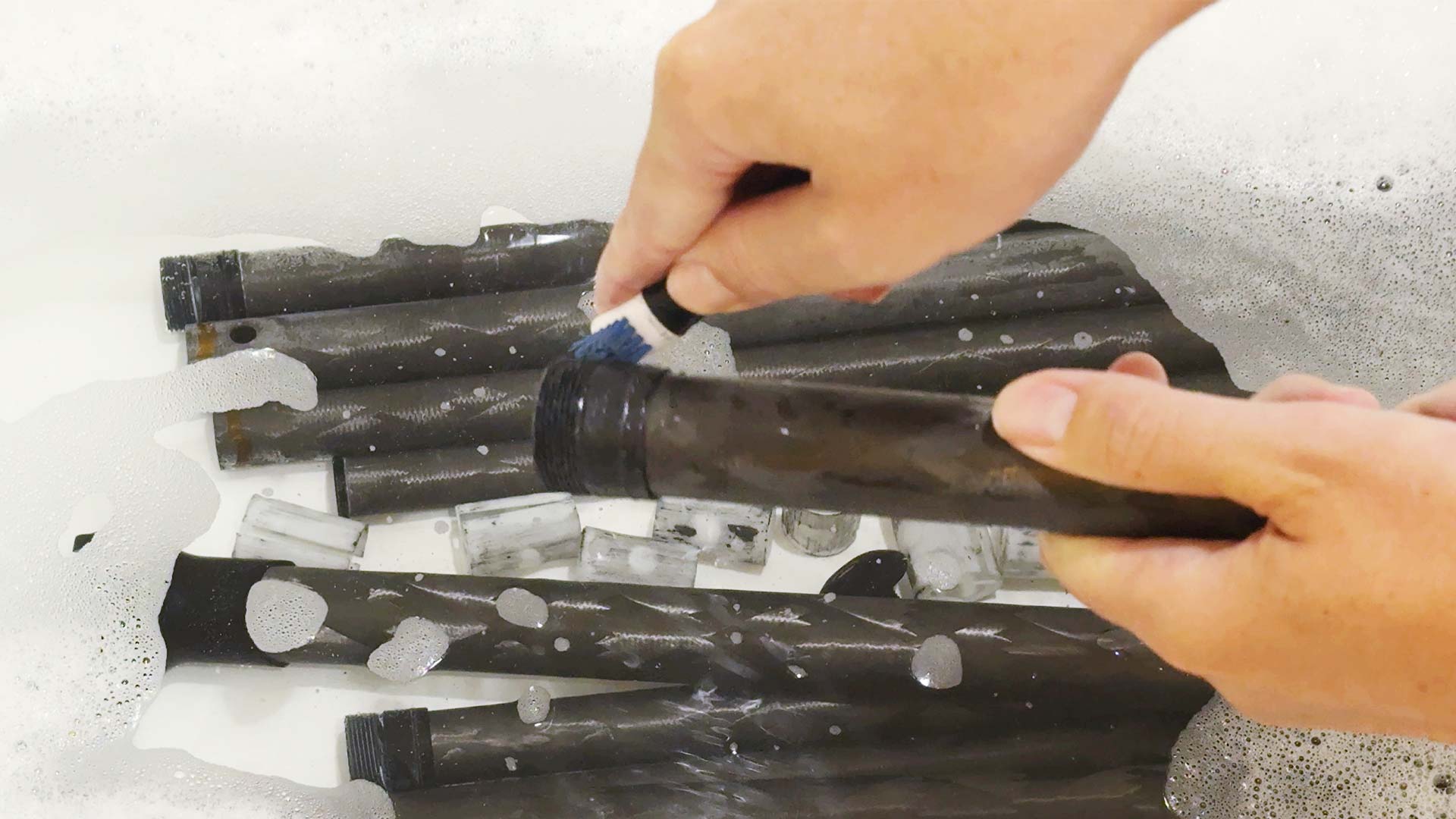 Using a sponge or rag, wash the legs and each individual part. When cleaning twist lock threads, use a small brush like this OXO Good Grips Brush to loosen and remove bits of grit and dirt inside the threads. Remember to do this to the threads inside each twist lock as well, in addition to the feet at the bottom. Basically anything with a thread, brush it.