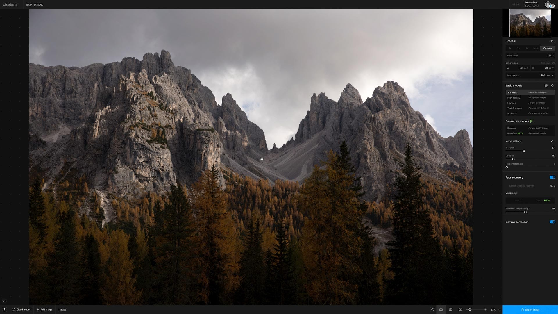 To push Gigapixel even further, I tried upscaling a DSLR image of mine to 60x40" (a very large print) using the Standard and Recover generative models. Standard generated a new, upscaled image in a handful of minutes. The Recover model took hours. So long in fact, I had to leave my computer running overnight.