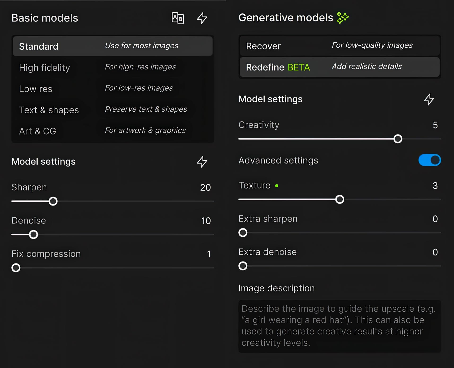 Generative models use the latest artificial intelligence to "generate" (hence the name) entirely new images using your original images as guides. Options include "Recover" and "Redefine". The former is designed for rebuilding details in low resolution images (and sticks more closely to the original image), while the latter takes much broader creative liberties. Similar to other AI-based image generation software, you may provide written descriptive prompts to help guide the creative process.