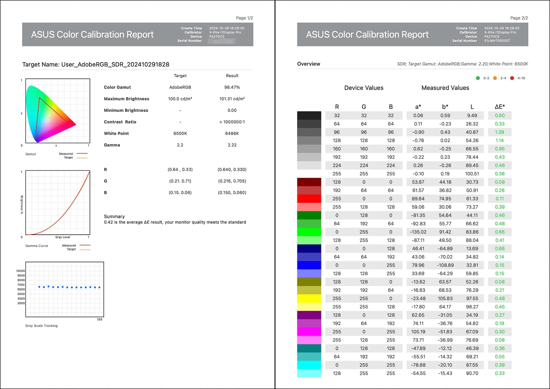 ASUS provides a printed calibration report in the box. Mine reported average Delta E (ΔE) values of 0.6 DCI-P3, 0.41 Adobe RGB, and 0.6 sRGB—excellent results, well within the range where any difference between on-screen and real-world colors is virtually undetectable.