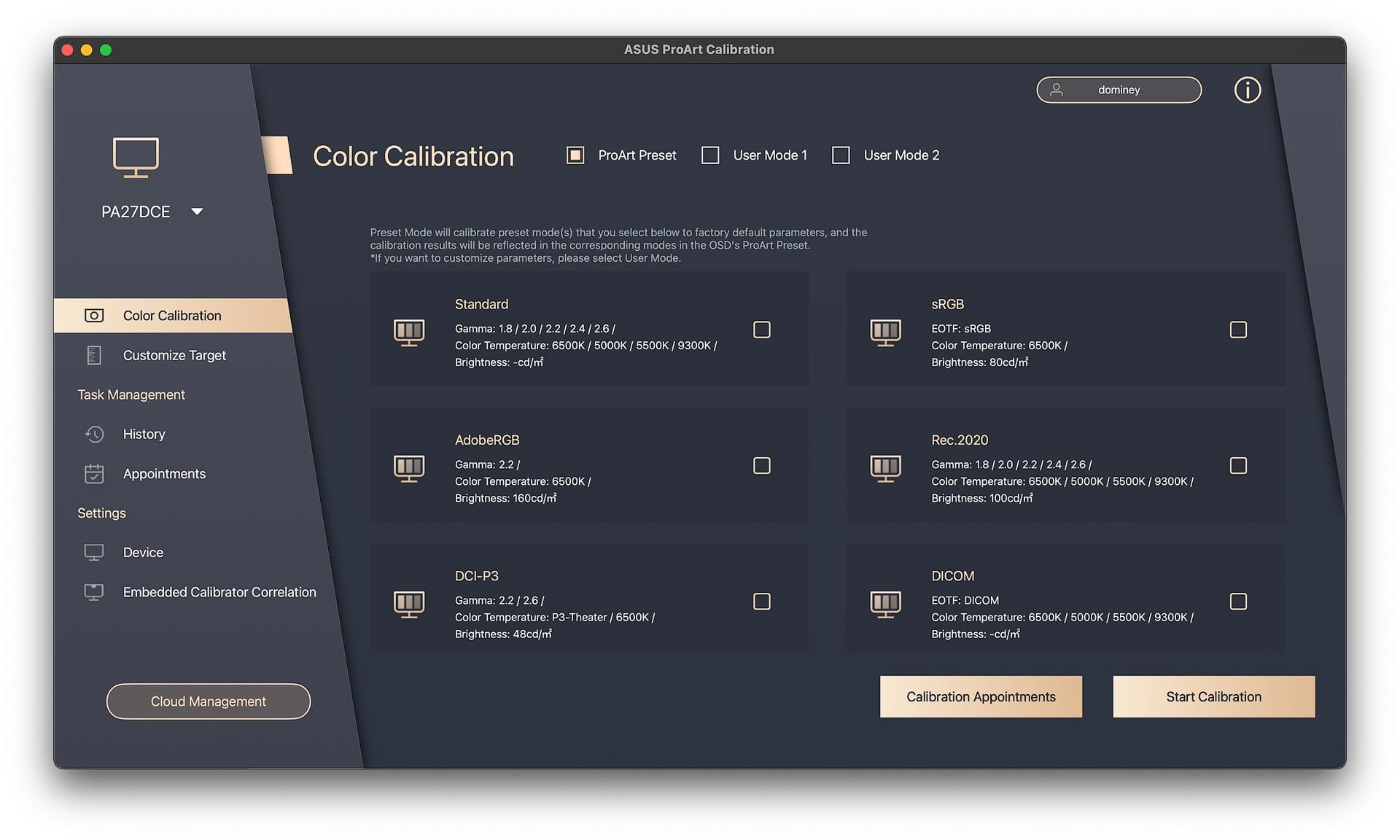 ProArt Calibration allows you to calibrate the display's built-in "Presets" (image below), which use predefined, factory default parameters for color space, brightness, gamma and temperature. Simply choose whichever preset you'd like to calibrate, plug-in your calibrator, and the software takes care of the rest. These built-in presets are ideal for users who don't want to create their own custom presets.