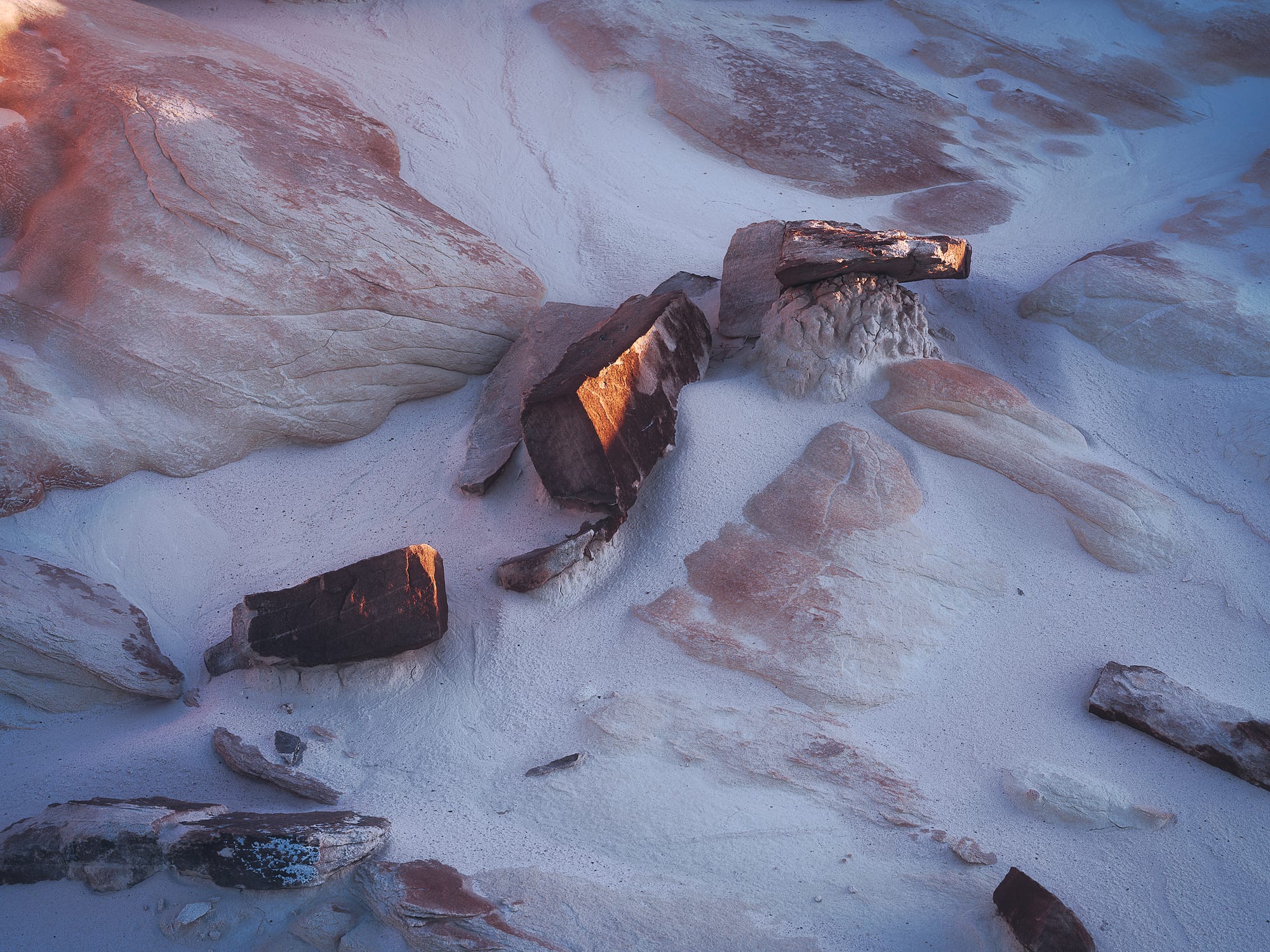 Three red stones, partially-sunk into white sandstone, glowing like embers in the last light. Just enough warmth to catch their tops. It stopped me cold.