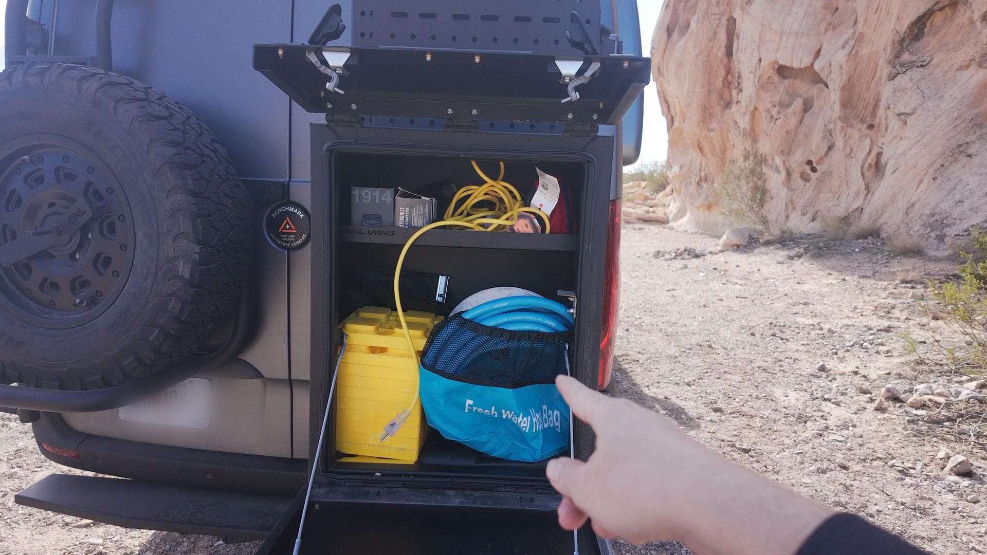 On the front of the right cabinet there's a fresh water gauge, temperature control and hand-held shower spray. With this, plus a provided magnetic curtain that mounts between the open rear doors, I can take an outdoor shower. Also handy for cleaning muddy shoes and gear.