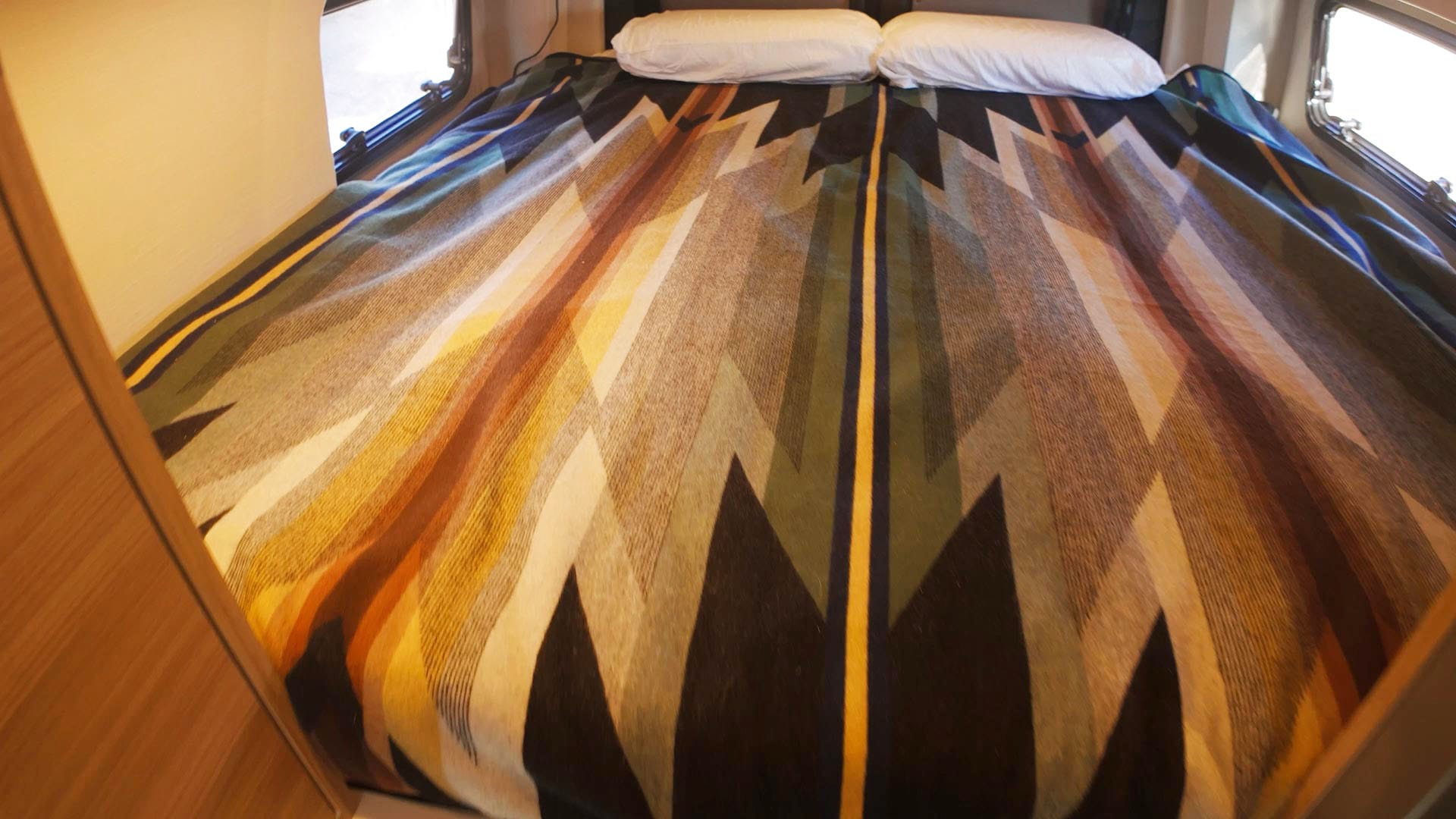 The most important thing to consider when designing a van interior is the bed. It takes up a lot of space, and it is also where you spend a fair amount of time each day. Every van I rented over the past few years, with one exception, had a sideways bed in the back. In that layout you sleep sideways, with exterior flares that extend the body of the van and provide a few more inches of head and foot room. It is the most common approach because it uses less interior depth and leaves more space for everything else.