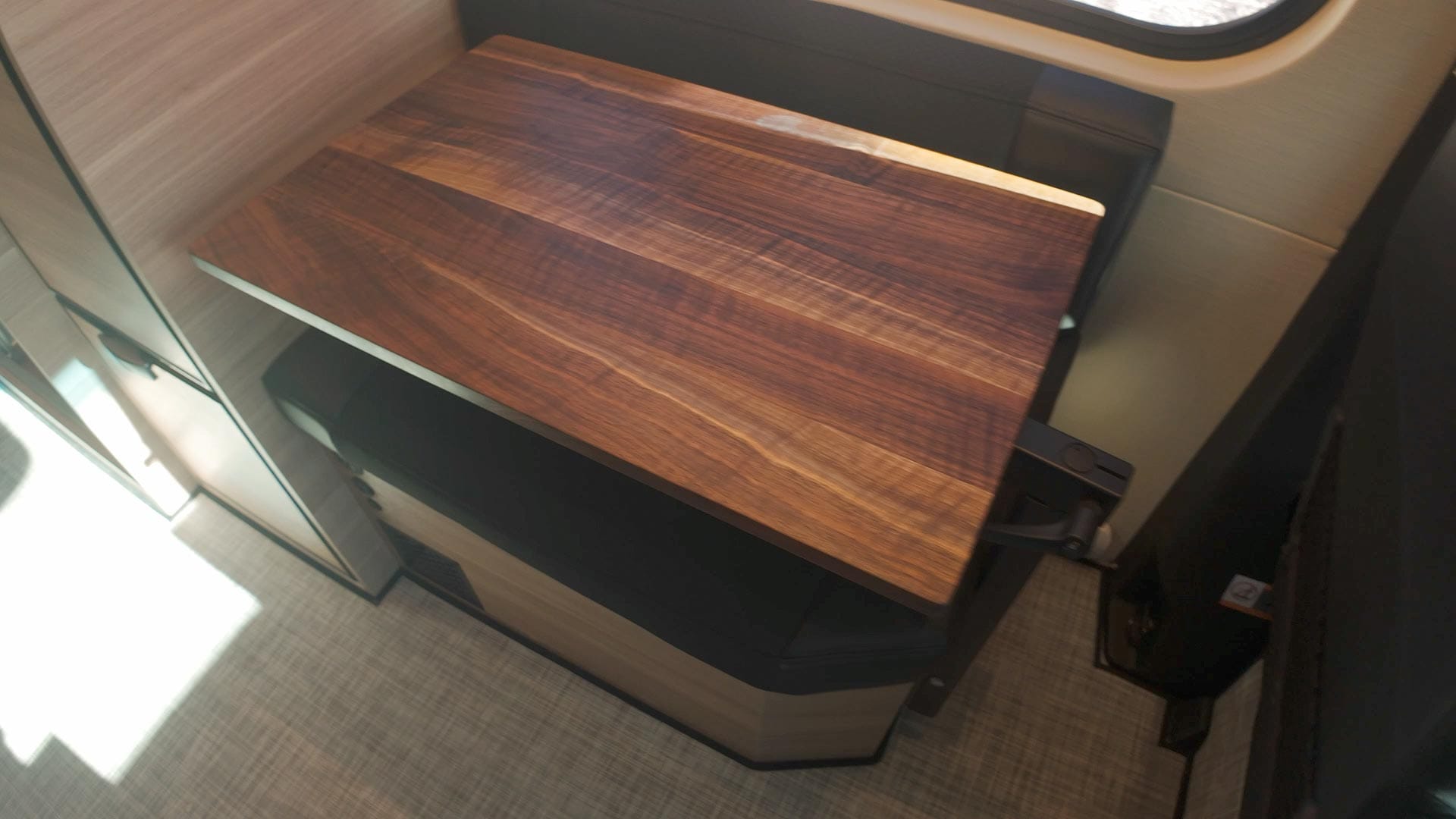To the right of the shower is a comfortable custom-built bench underneath the window. Mounted to the side is a Lagun table arm with a custom wood top measuring 18x29". The front of the bench has a 110v power outlet, a USB-C and A outlet, plus another USB-C outlet which connects to a Thunderbolt 4 hub mounted inside the bench.
