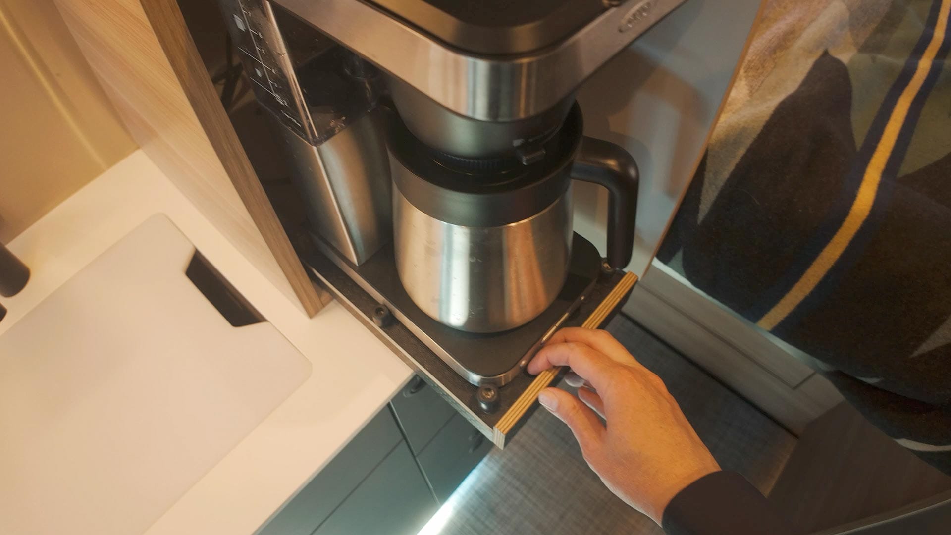 In the kitchen area there's a custom built cabinet for storing a drip coffee maker and grinder, with an interior electrical outlet and sliding drawer. This makes it super easy to make coffee in the morning, then close and put it away thereafter.