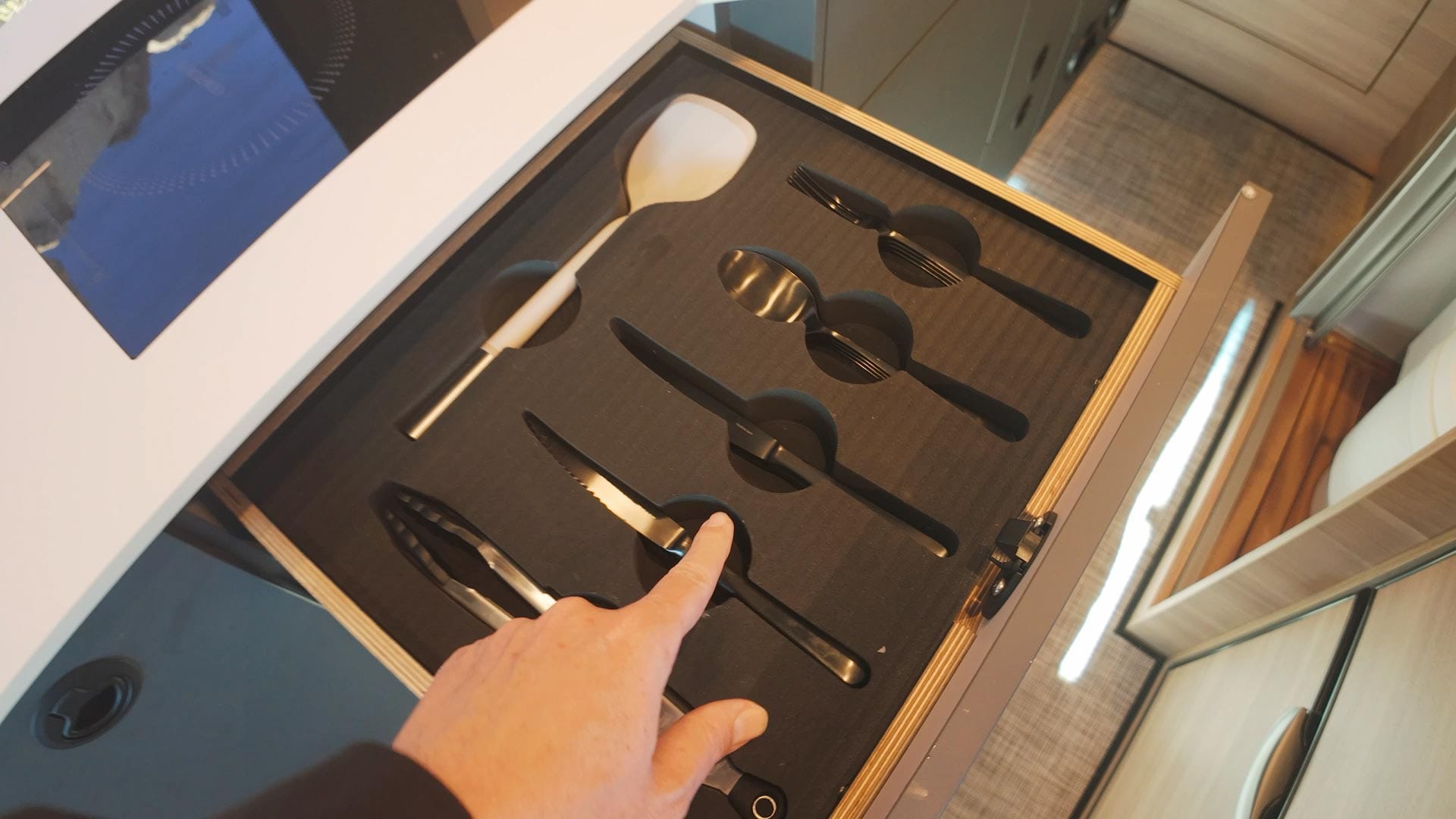 Inside the lower cabinets, Benchmark designed drawers with foam inserts for cutlery, plates, bowls, mugs and cups. The foam negates rattling when driving, while also providing a clear place for everything to be stored when not in use.