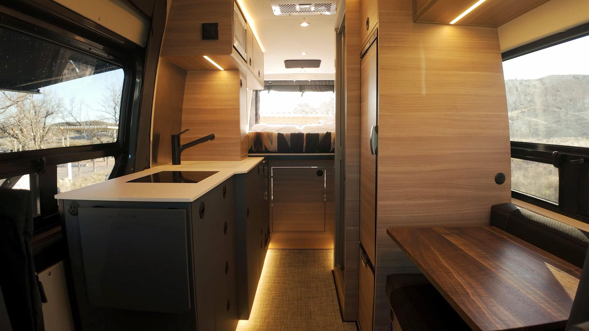 I ordered the Sprinter from Mercedes with nothing on the inside. Just a blank, metal box. Benchmark overhauled the interior with a clean, minimal aesthetic, plus a number of clever features based on my wish list and design feedback.