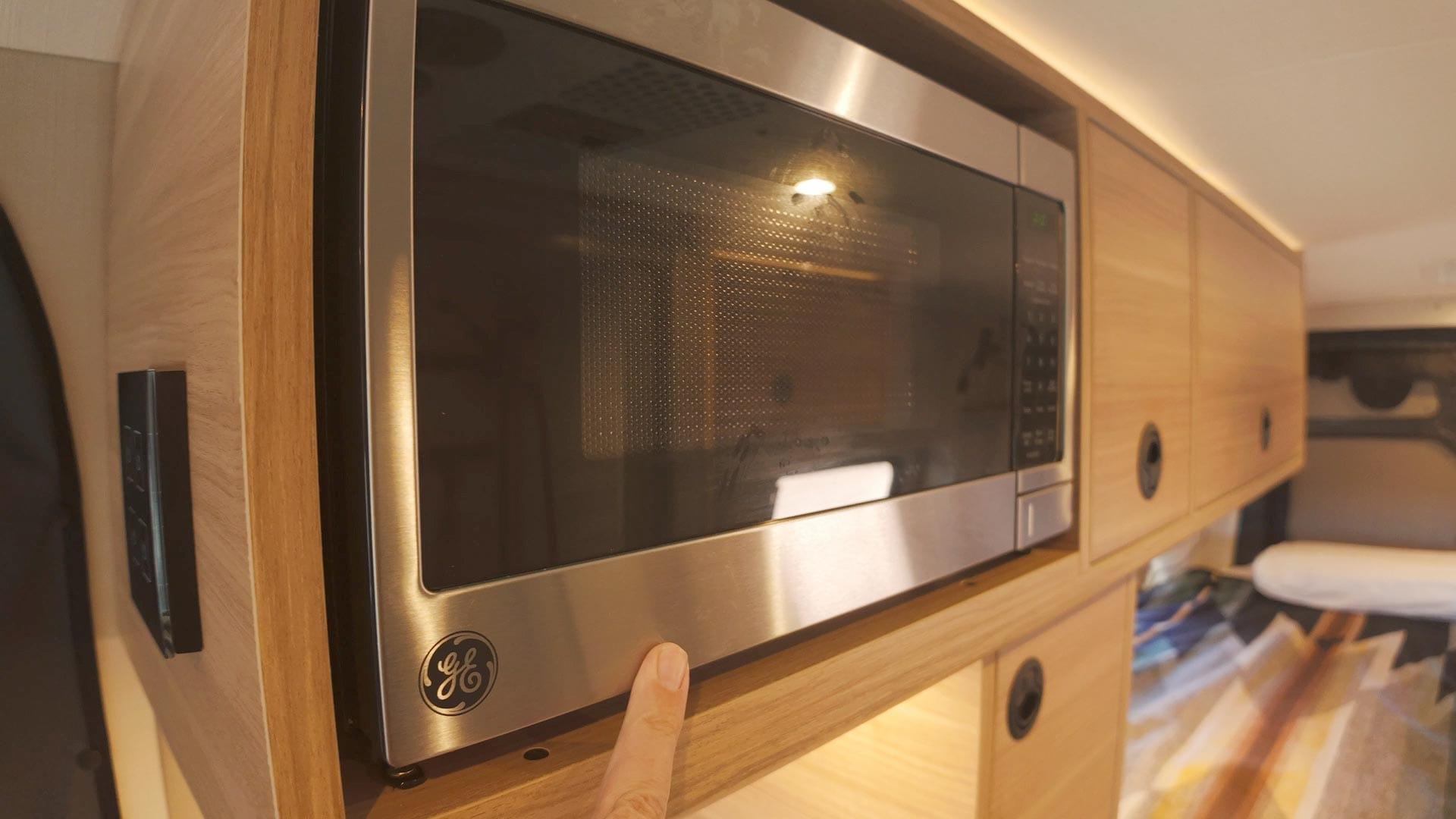 Above the sink is a custom built wood cabinet housing a low-wattage GE microwave oven. I don't see myself using this that often, but it's nice to have when reheating leftovers. I purposely placed the microwave on this side of the van so it wouldn't be in line of sight when entering the van through the side door.