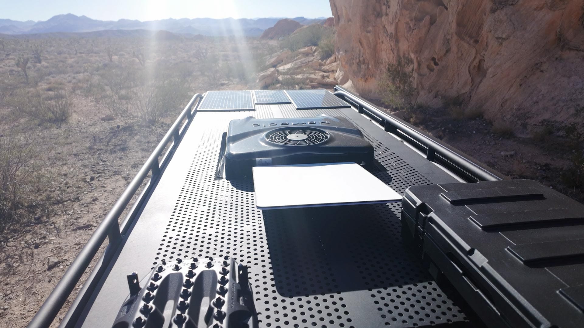 Running down the entire rooftop is a Safari Rack made by Paragon Offroad. This provides mounting points for exterior LED lights, three Obsidian solar panels, Maxtrax recovery boards, a Starlink Performance panel (for satellite internet just about anywhere), plus a Roam 83L storage case for extra things like recovery gear, shoes, etc. There's also a Maxxair Fan (essential in any van build), plus a Nomadic Cooling X3 air conditioning unit which can run off the house batteries when the engine is turned off.