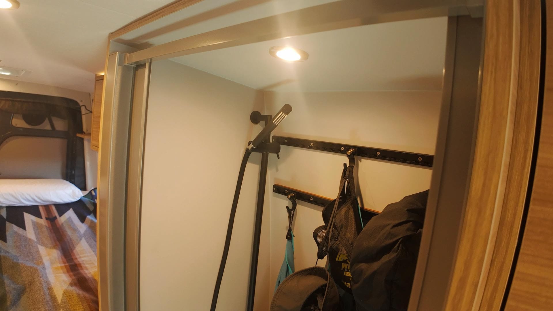 Across from the kitchen is a shower and toilet. The shower doubles as a wet closet with two L-tracks for jackets, hats or other items when not in use. The shower is compact and taps into the general 35 gallon water tank, so it's more of a "navy shower" for quick use. There's another shower in the back of the van which I'll come back to in a minute.