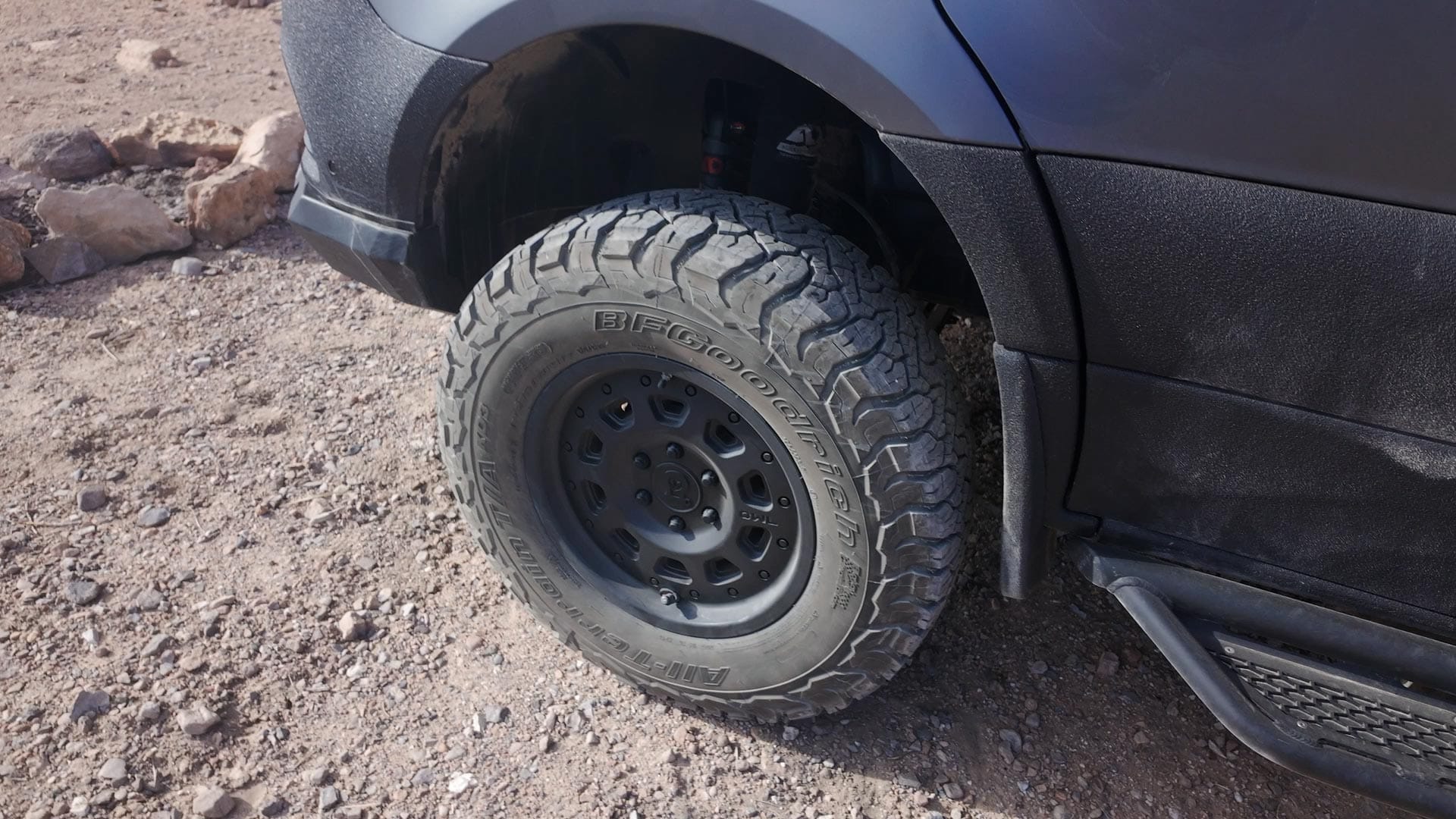 Benchmark upgraded the suspension with an Agile Offroad RIP Kit, plus black aluminum Talon wheels from Owl Vans and BFGoodrich Ko3 all terrain tires. All four wheels have quick release air valves for rapid air-downs when driving off-road. To air back up, there's an ARB dual air compressor inside the engine compartment with hose hookups in the front and rear of the van to reach all four tires. The air compressor is turned on/off through a Switch Pros interface mounted in the dash.