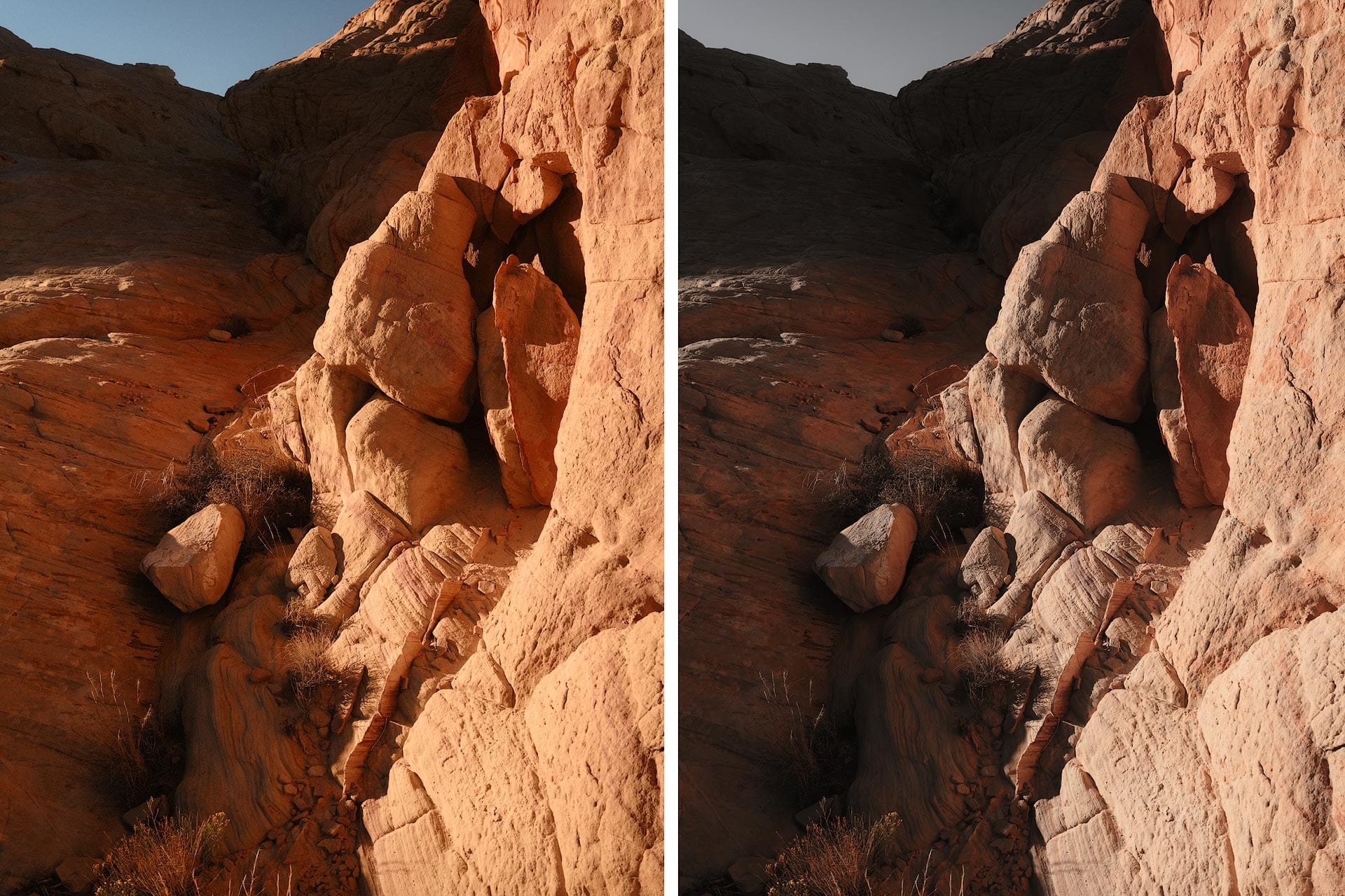Here's a second example with a different outcome. With this image, negative Vibrance completely drains the colors, which suggests saturation across the image is low and evenly distributed, and might benefit from a boost.