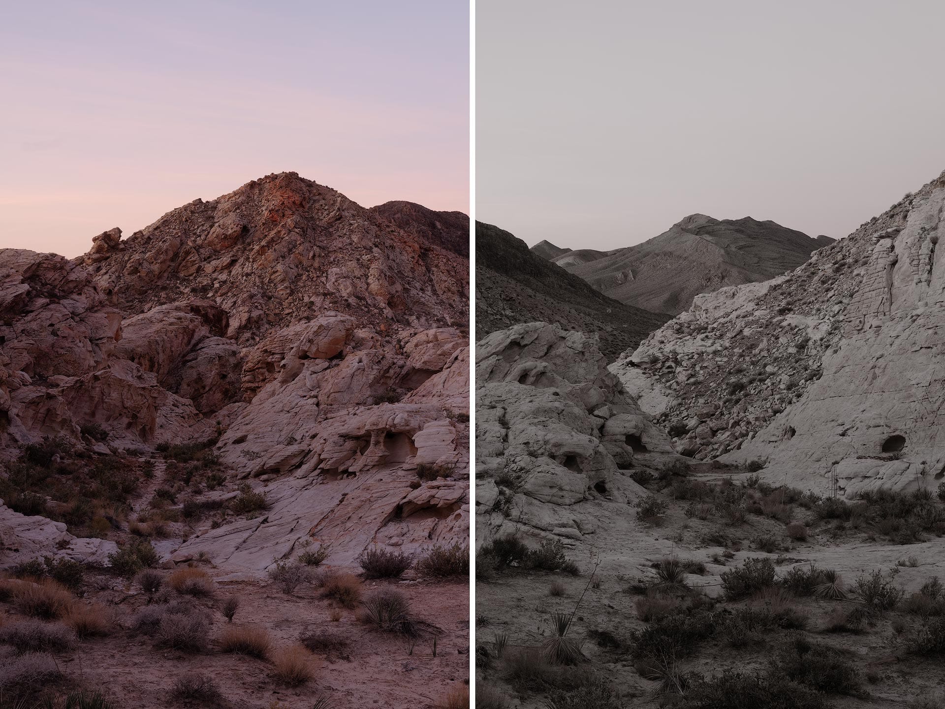 What you're seeing is color stripped away from pixels with low-to-medium saturation. Any color that remains has elevated saturation. In the before/after example above, the bright red rocks in the foreground hold their color while everything else goes gray. That tells me that saturation in those areas is high relative to the rest of the scene.