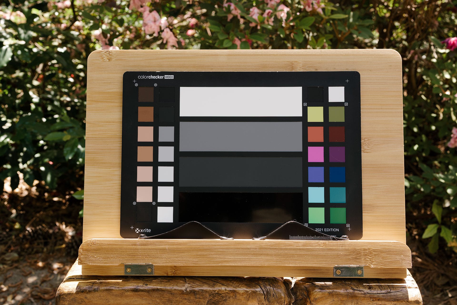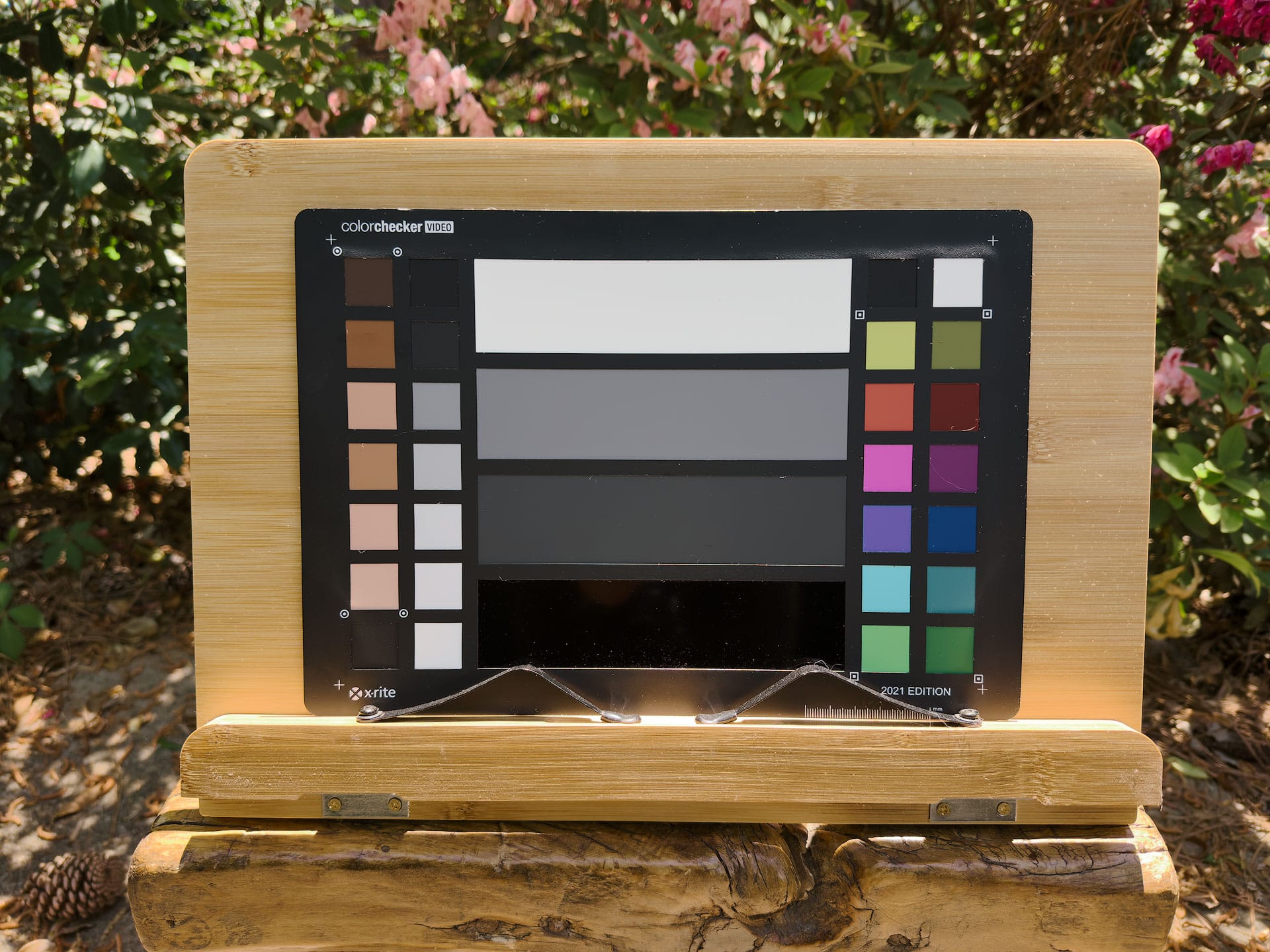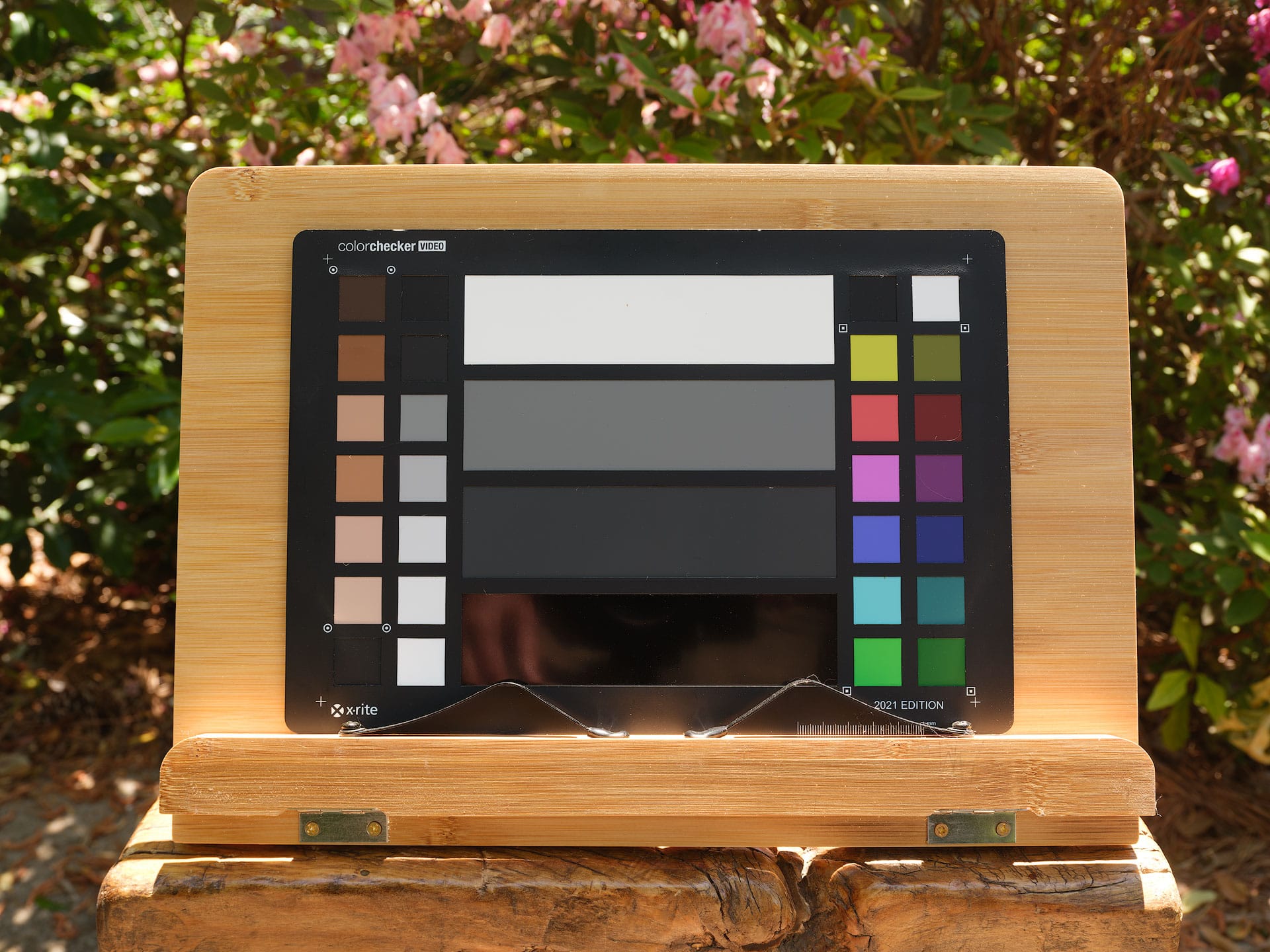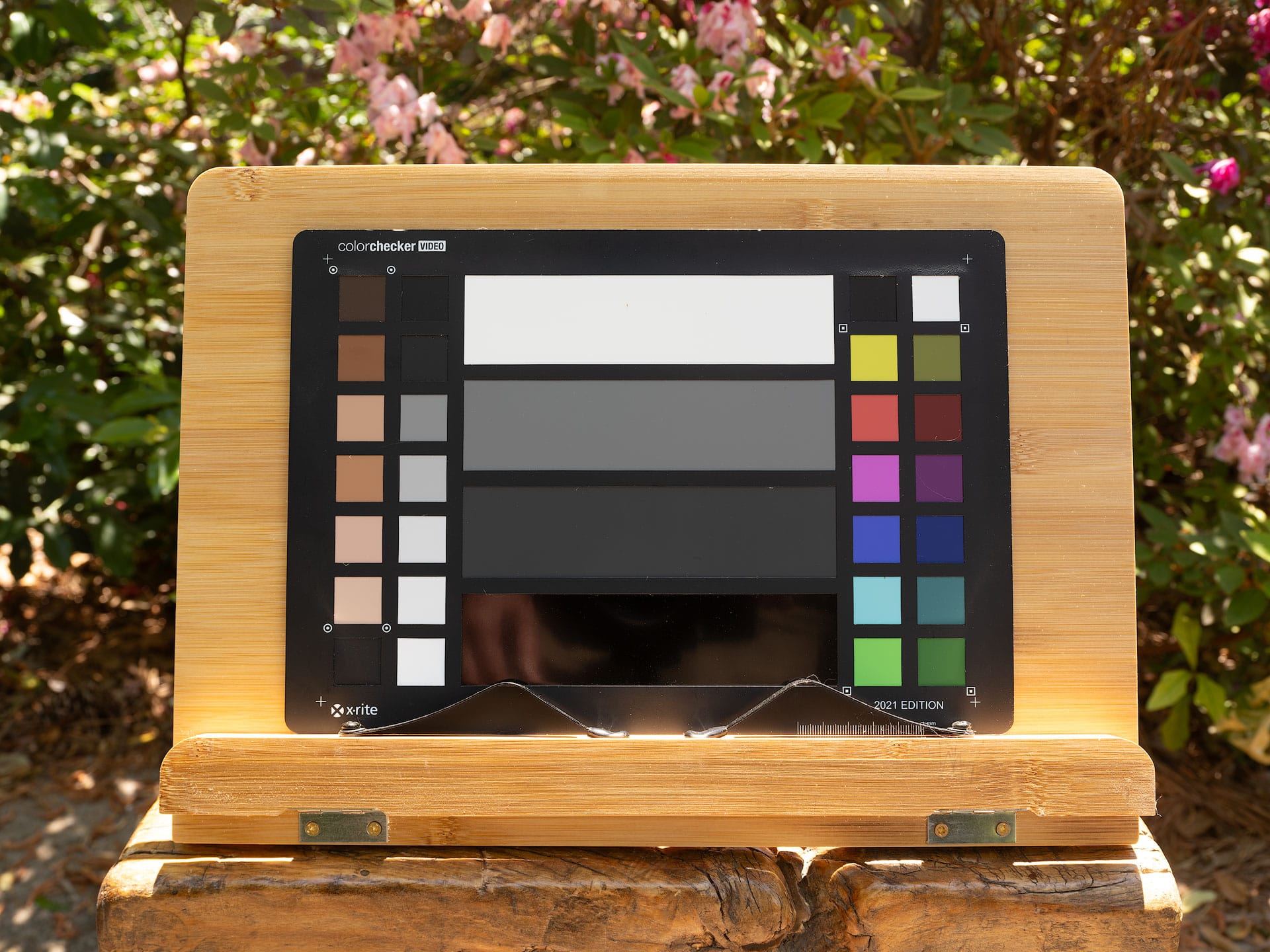 Below are before/after examples from raw files captured with a Fujifilm GFX 100S II. The only change made to each file was swapping the profile in Adobe Lightroom Classic. This first comparison shows Adobe Color, Lightroom's default profile, against Color Precision's Fuji Pro 160S Frontier profile. The Fuji Pro 160S profile is less vibrant and saturated, which is consistent with the character of color negative film. To my eyes, it reads more natural and less digital. I especially like how it pulls the excess yellow and red out of the wood grain and skin tone chips on the color checker card.